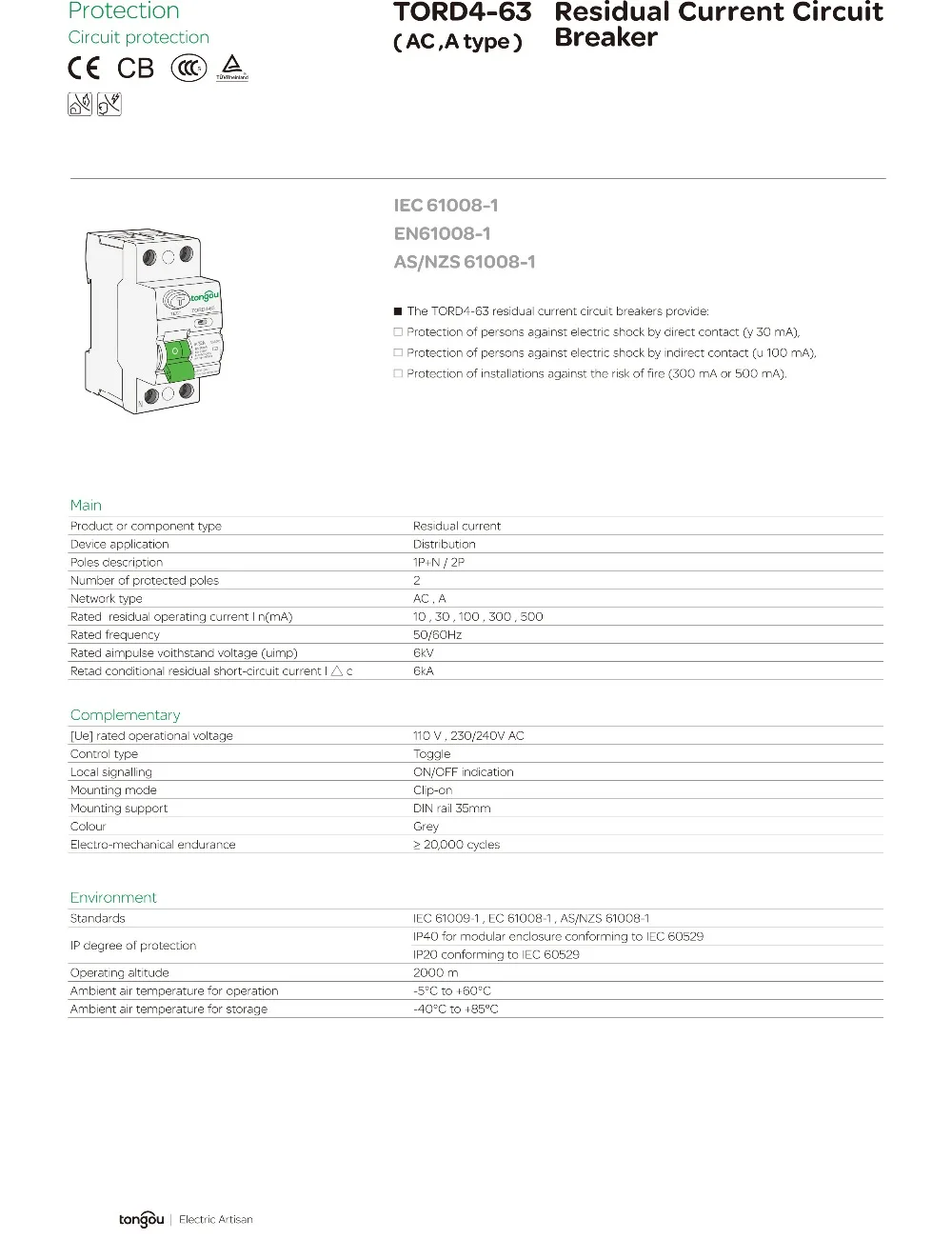 УЗО AC 2P 16A 10mA 30mA 6KA RCCB RCD 110В 230В выключатель переменного тока дифференциальный выключатель безопасности TORD4-63