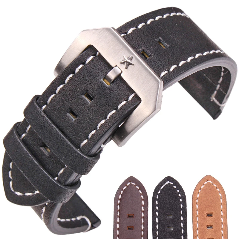 Ремешок для часов из натуральной кожи, 24 мм, черный, темно-коричневый, женский и мужской браслет с серебристой классической пряжкой Для Panerai