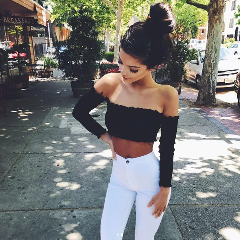 LUOYIYANG, футболка с открытыми плечами и длинным рукавом, Женский кроп-топ, стриженный кроп-топ, эластичная Клубная женская рубашка