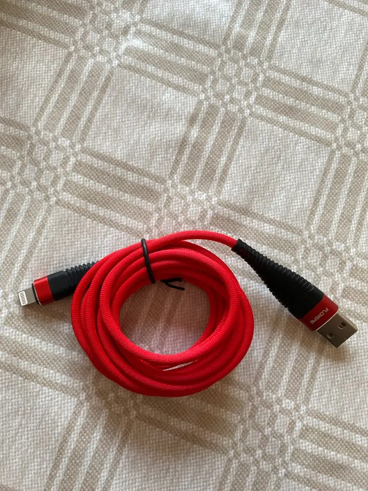 Кабель рабочий, красного цвета, хорошо заряжает. Отличное качество, брала уже два раза. Выглядит в точности как на картинке