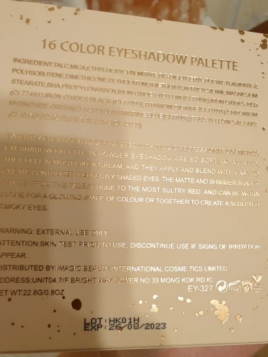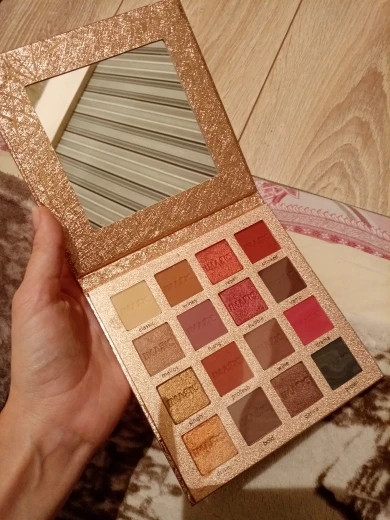 Очень красивая палетка, оттенки теней великолепные и само оформление красивое! Тени лежали в картонной коробке, на ней был напечатан состав. Указан срок годности. Картонная палетка, закрывается на магниты. Вес 28,8 гр. В палетке 16 разных оттенков. Есть перламутровые тени, и шиммер, и матовые, на любой вкус, все оттенки по своему красивые. Можно сделать как дневной, так и вечерний макияж. Пигментация хорошая, оттенки все красивые. На кисть набираются легко, ложатся на веки отлично. Растушевываются хорошо, не скатываются. Повели тени себя в течении дня отлично!
