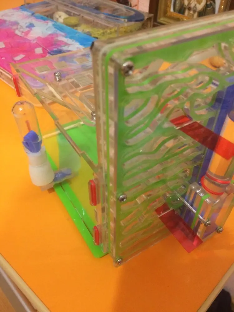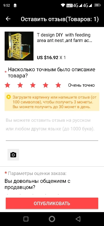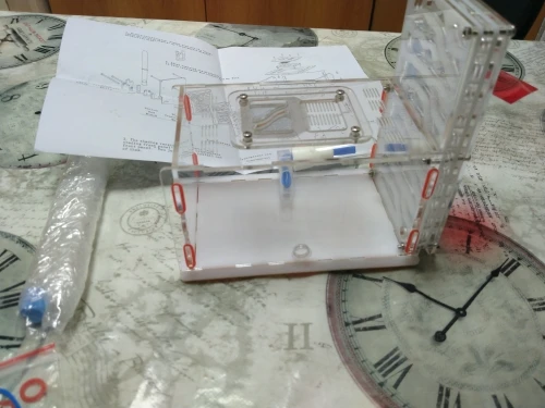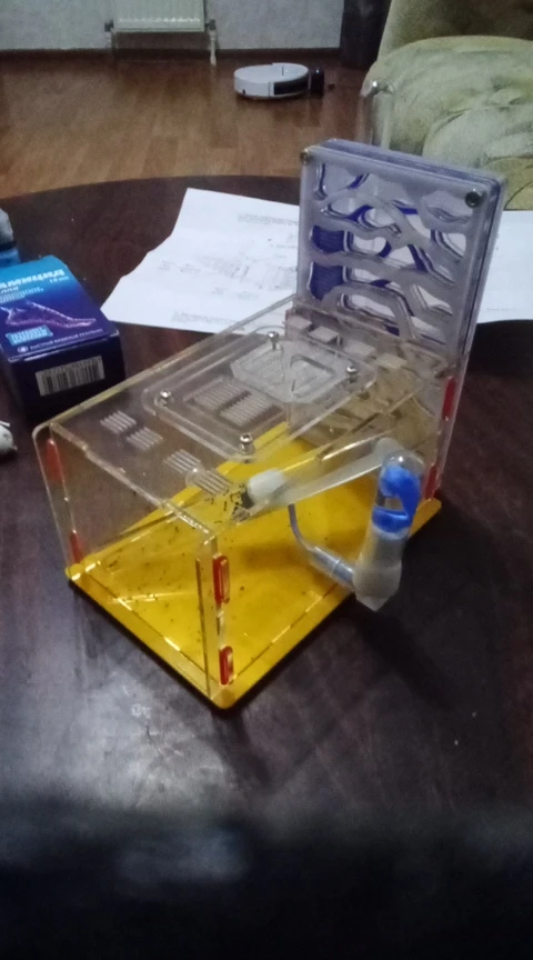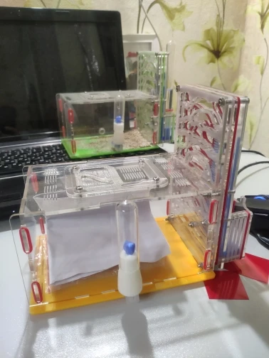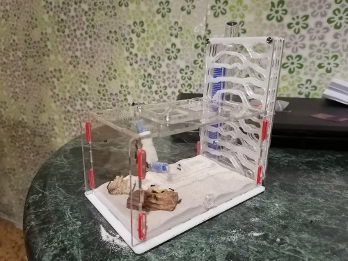 Товар пришёл через неделю, упаковано все аккуратно в пупырём и картонную коробку, все комплектующие вырезаны аккуратно и точно размер в размер, собирать легко и просто, можно даже без инструкции, хотя она и есть в комплекте, долго только от комплектующих отрывать пленки, после сборки выглядит красиво - это что касаемо плюсов! Из МИНУСОВ!: резинки на которые крепиться арена слишком тонкие и поэтому арена вся шатаешься и слишком большие щели, маленькие муравьи убегут, пришлось модернизировать, докупить сантехнических резинок и усилить ими, после этого арена стала супер; на крышке ручка не комплект, это тоже мелочь; после того как заполнил водой башню и поилку, оказалось что они протекают, может надо было сильнее стягивать болты? Но я побоялся, могло треснуть оргстекло, уж слишком оно тонкое. Надеюсь со временем перестанет подтекать. В целом и общем твёрдая 4.