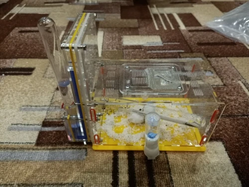 Доставка курьером до двери, все детали в комплекте, все в хорошем состоянии, есть инструкция. Упаковочная бумага с деталей легко снимается после намокания. Возлагаем большие надежды на эту новую систему увлажнения. В наших старых аналогичных формикариях с увлажнением дело обстояло плохо: губка отделена от гнезда металлической сеткой, мураши просачивались туда и погибали, губка быстро начинала покрываться черной плесенью. Из-за этого формик приходилось часто разбирать и мыть, мурашей переселять и подвергать их лишнему стрессу. Здесь губка отделена от мурашей пластиковой перегородкой, больше, чем усы, никто из них туда не просунет. Надеемся, что теперь проблема решена. Верхняя крышка очень хороша, конструкция исключает лишние побеги, для небольших спокойных колоний использование антипобега необязательно. Увлажнение арены - тоже большой плюс, особенно, для уезжающих в отпуск.