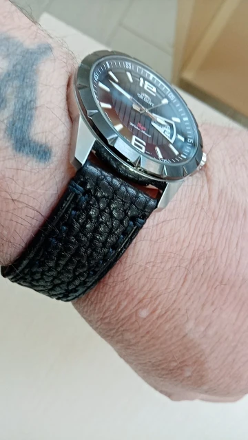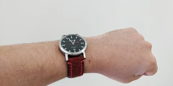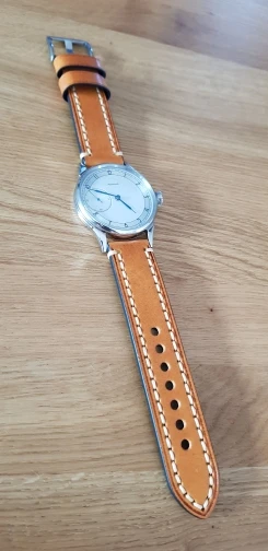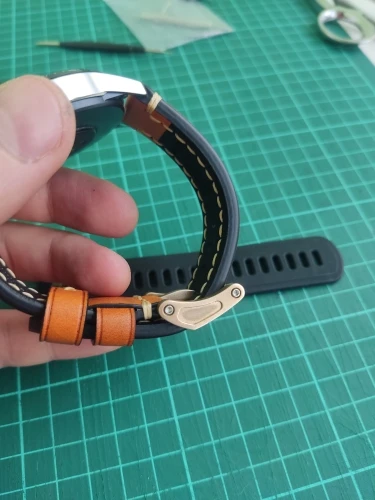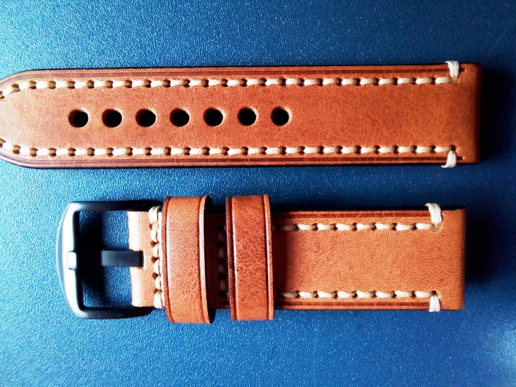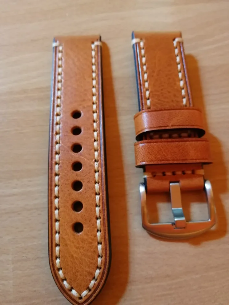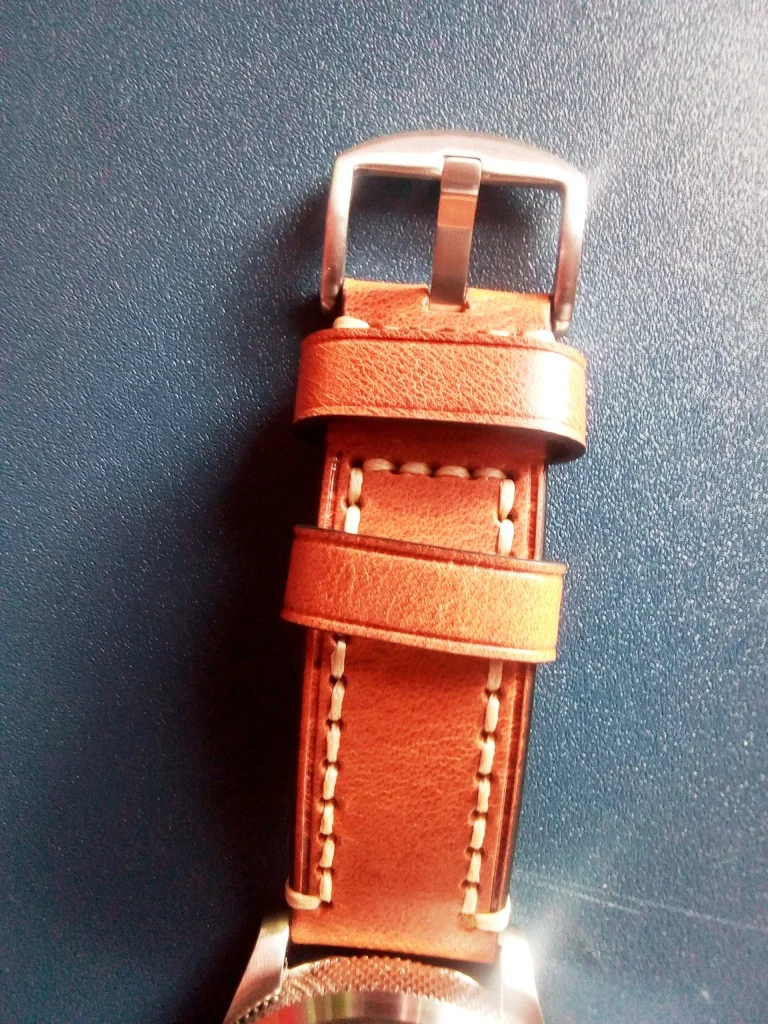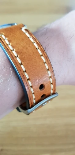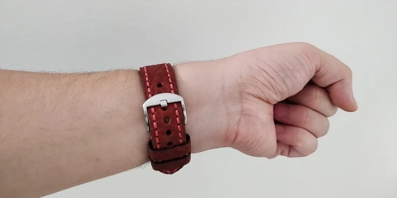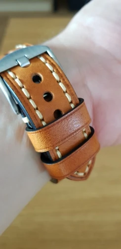ремешок пришел за 10 дней в МО, качество классное: натуральная кожа пахнет кожей, ручная прошивка плотной нитью (лучше всегда брать именно прошитый вариант, т.к. он менее растягивается в процессе эксплуатации), кожа плотная 4мм, торцы хорошо обработаны очень качественно, в общем все на высоте. цвет хоть и маркий и со временем думаю слегка потемнеет, но цвет очень симпатичный, пока жестковатая кожа (по сравнению с силиконовыми моделями , но приработается со временем). по соотношению цена-качество просто супер, рекомендую. единственный небольшой минус - это отсутствие осей с ушками для быстрого съёма ремешка (как это сделано в фитнес браслетах - не знаю как точно это называется)), т.е. по-хорошему, в эту модель можно было бы поставить эту проушину, тогда ремешок можно было снять за 15-20 секунд, и быстро одеть другой. а так придется пользоваться инструментом специальным и это дольше. это пожелание производителю улучшить модель. в целом, ещё раз - все круто, доволен покупкой. спасибо!