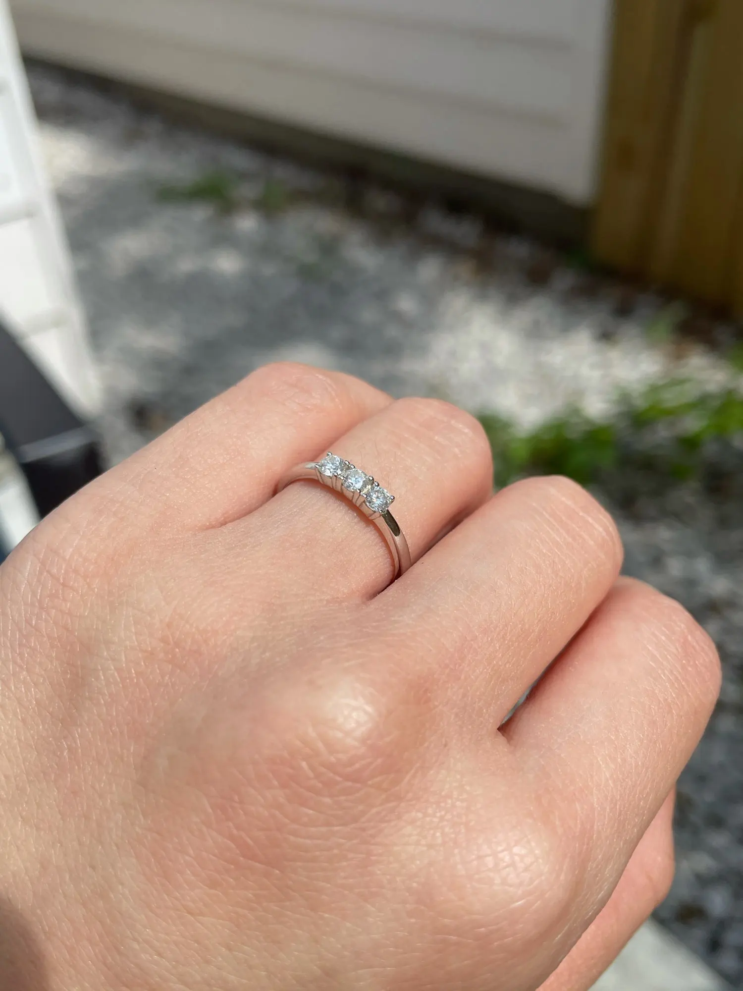 Juat получил круглая огранка 0.3ctw 3 мм F цвет лаборатория выращивает Moissanite алмазное обручальное кольцо сегодня .. На несколько дней позже, чем ожидалось. Доставка в сторону, браслет выглядит потрясающе, просто еще не сделал предложение моей подруге, но я очень уверен, как только она обнаружит, что она будет очень взволнована. Нужно будет смотреть на кольцо под прямыми солнечными лучами, чтобы определить, насколько ярко моисаниты .. Они выглядят немного тусклыми в помещении, но в целом я очень доволен своим заказом. Спасибо вам