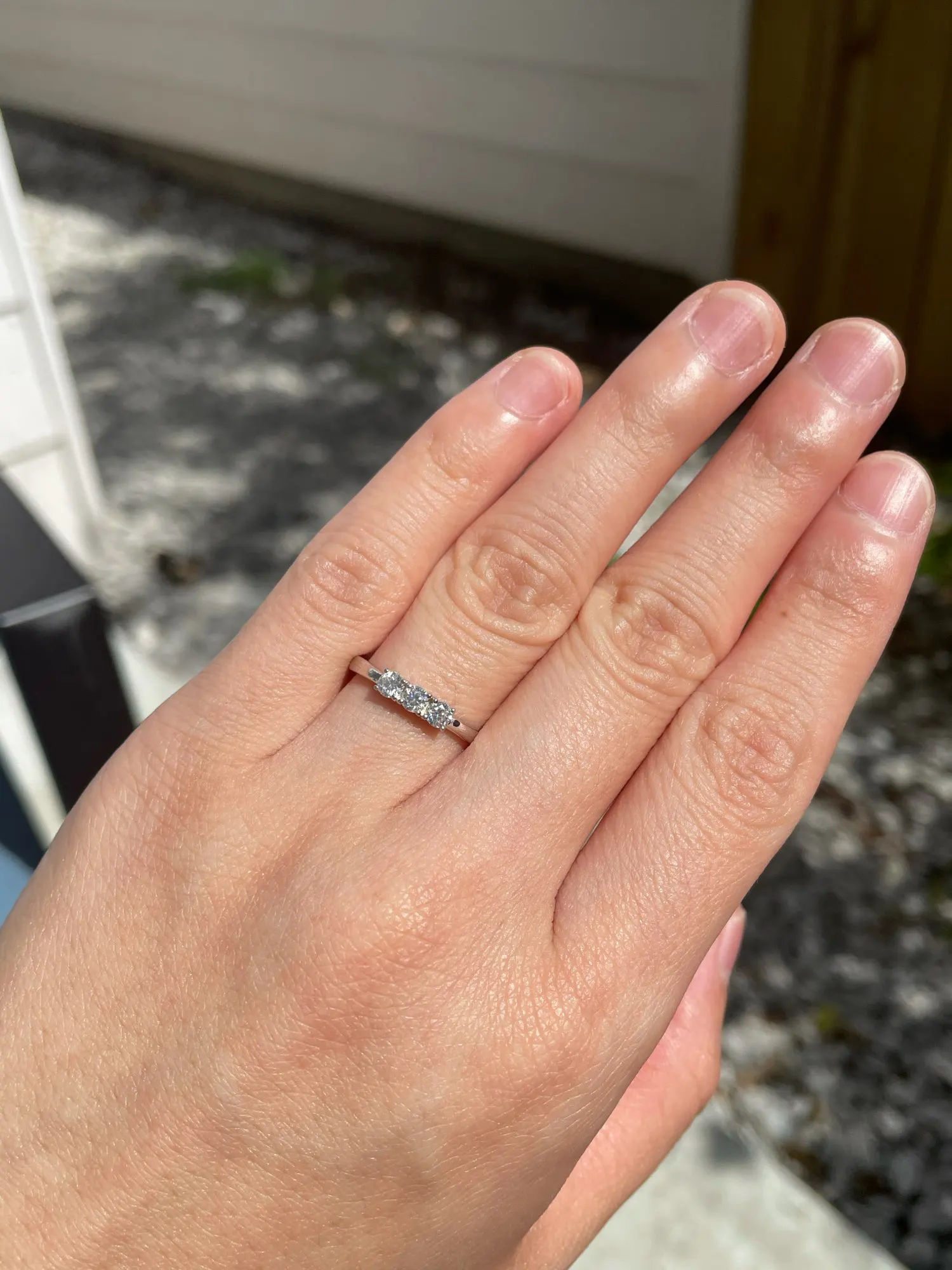 Доставка чуть больше 2 недель до Нижнего Новгорода. Кольцо выполнено аккуратно, крапаны не цепляются. Размер 5,5 на российский 16,5. Сертификата на камни нет. Проба есть. В помещении камни тусклые, на солнце переливаются всеми цветами радуги, бриллианты "играют" по другому, всё-таки. Рядом с кольцом с бриллиантами. В общем, всё ожидаемо, всё устроило, качество исполнения порадовало. На каждый день вполне приличный вариант.