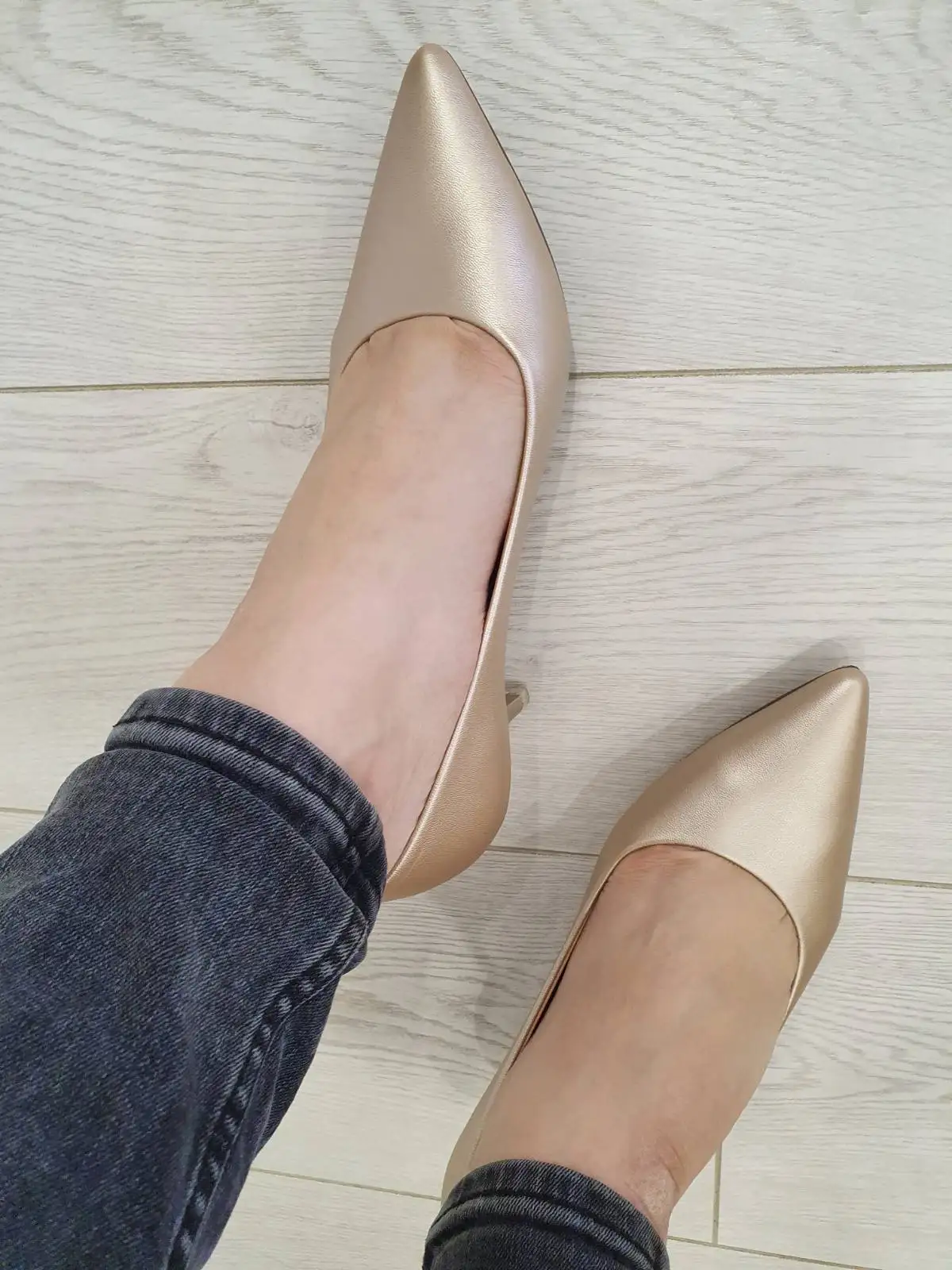 Хорошая обувь, брала цвет gold, туфли на удобном маленком каблуке. Внутри стельки есть подушечка мягкая. Мыс острый, в меру длинный, средний . Я всегда на али беру размер больше чем мой русский. На длинну стопы 23.7 брала 24см или 38 размер. Сели хорошо , не жмут, учитывайте что нога будет летом или в офисе отекать. Я хочу еще взять такие чёрные. Очень удобные. Упаковано отлично не помялись.