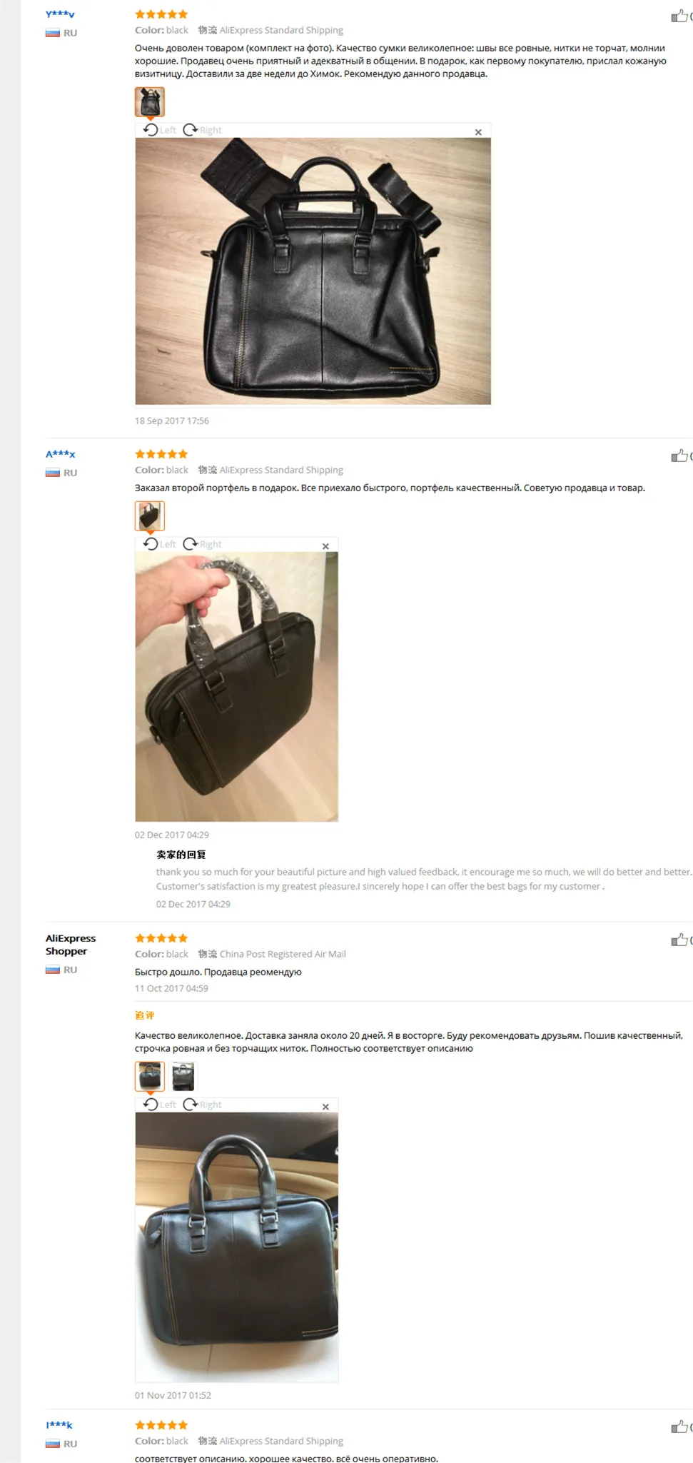 Сумка отличная, точно такая же, как и в описании и на фото. Кожа мягкая, запах натуральной кожи, хотя сейчас могут сделать всё что захочешь, но на вид смотрится презентабельно, кому понравилась на фото, берите не пожалеете. Замки работают отлично без заеданий, короче всё на высоте, за такие деньги, в РФ если покупать, то наверняка будет в два раза дороже - это факт! Продавца рекомендую, посылку отправляет сразу же после оплаты!