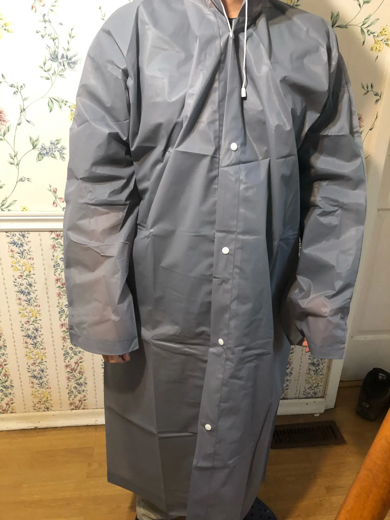 Подходит на большой рост (я 176 см, мне длина плаща доходит до середины икры), влезет на осеннюю куртку среднего объёма. Плотность материала вообще не впечатлила. Кажется утолщенным в большей степени за счёт рельефа. Он, конечно, потолще, чем одноразовые дождевики, но.. но, но. У меня был классный плащ такого плана, но его, к сожалению, украли. Есть с чем сравнивать, и этот ни в какое сравнение не идёт с предыдущим. Жаль, столько времени ждала его (доставка до СПб почти 2 месяца) - и всё зря. С продавцом не общалась, рекомендовать товар как качественный не могу.