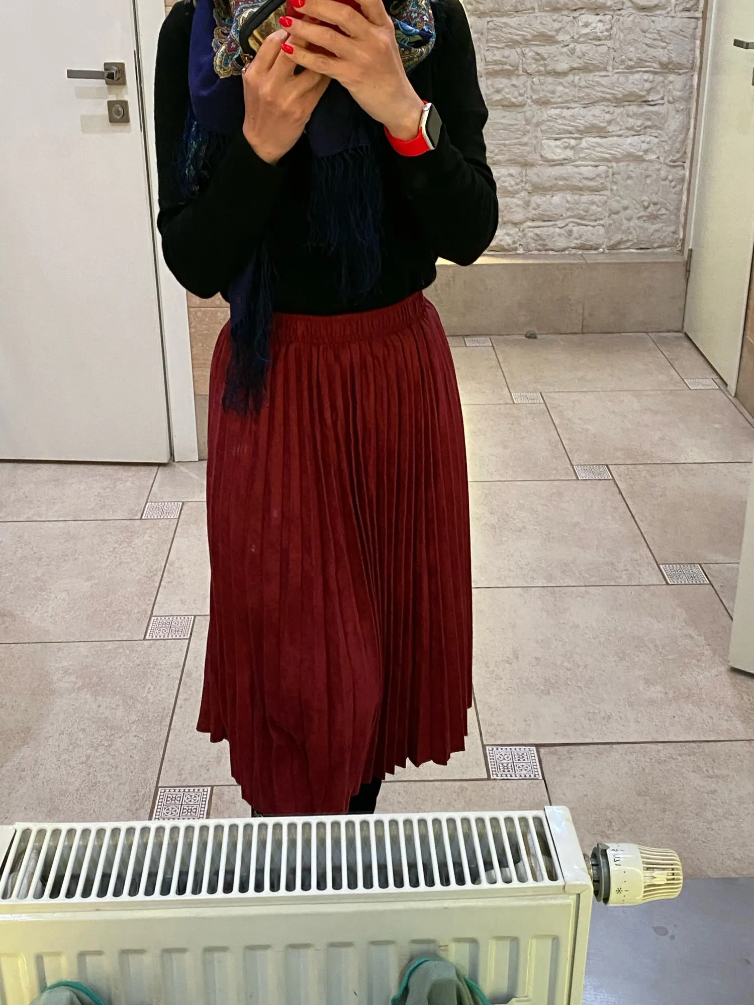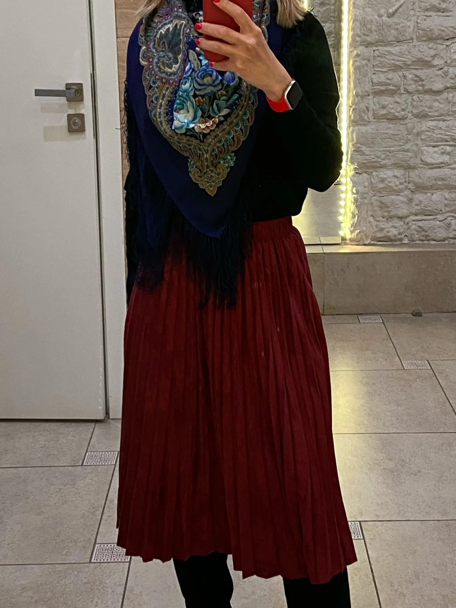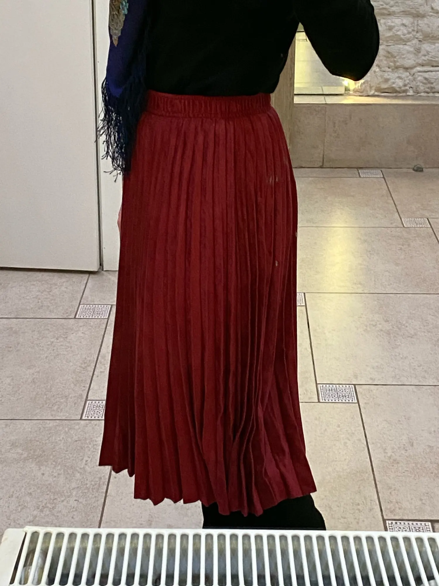 Цвет бордовый винный, красивый. Ткань плотная, как замша, есть подклад черного цвета ниже колен. Очень электризуется, прилипает всë, нужен антистатик. На талию 68 см сидит неплотнено, думаю, что подойдет на талию до 78 см точно.