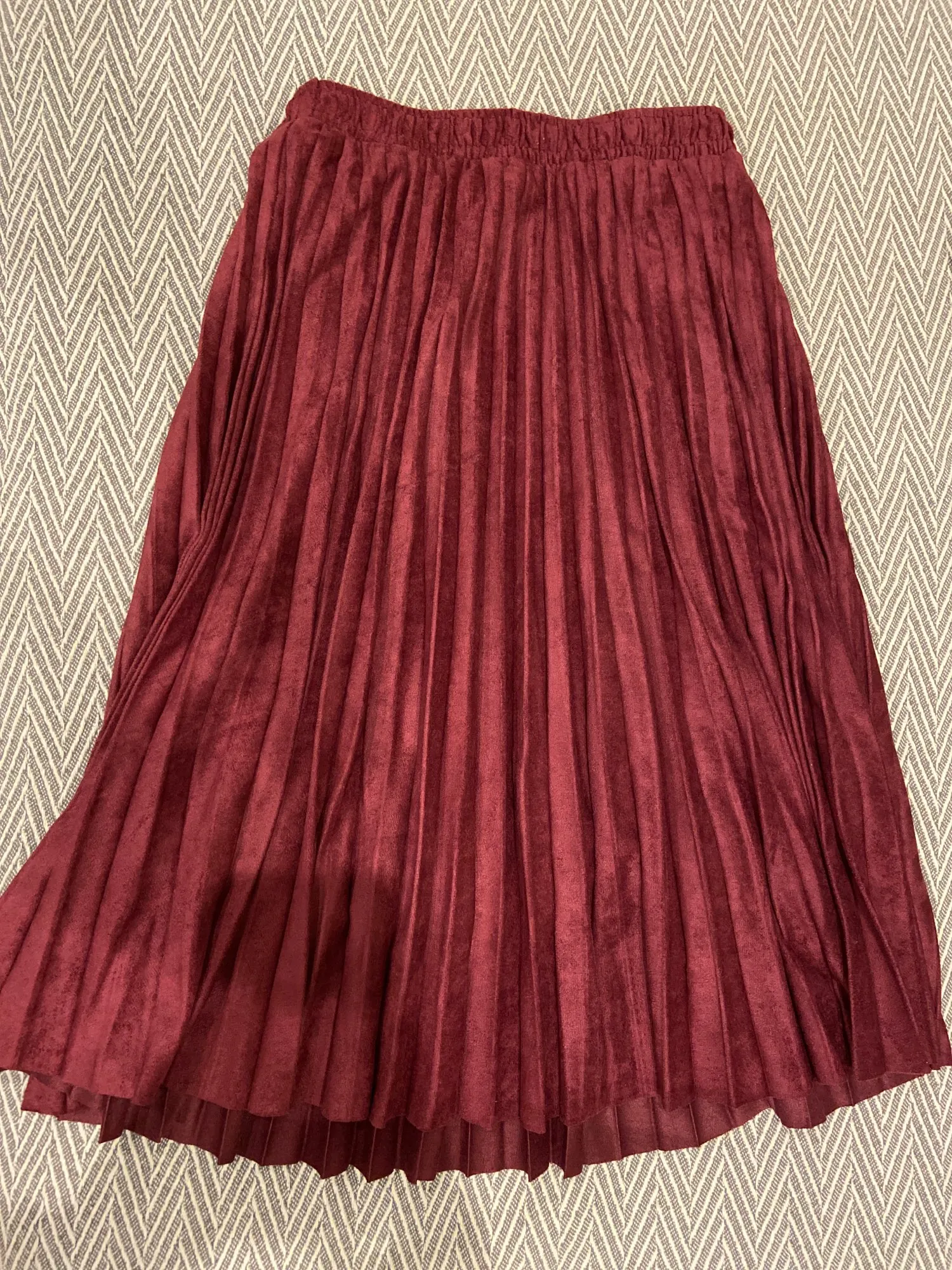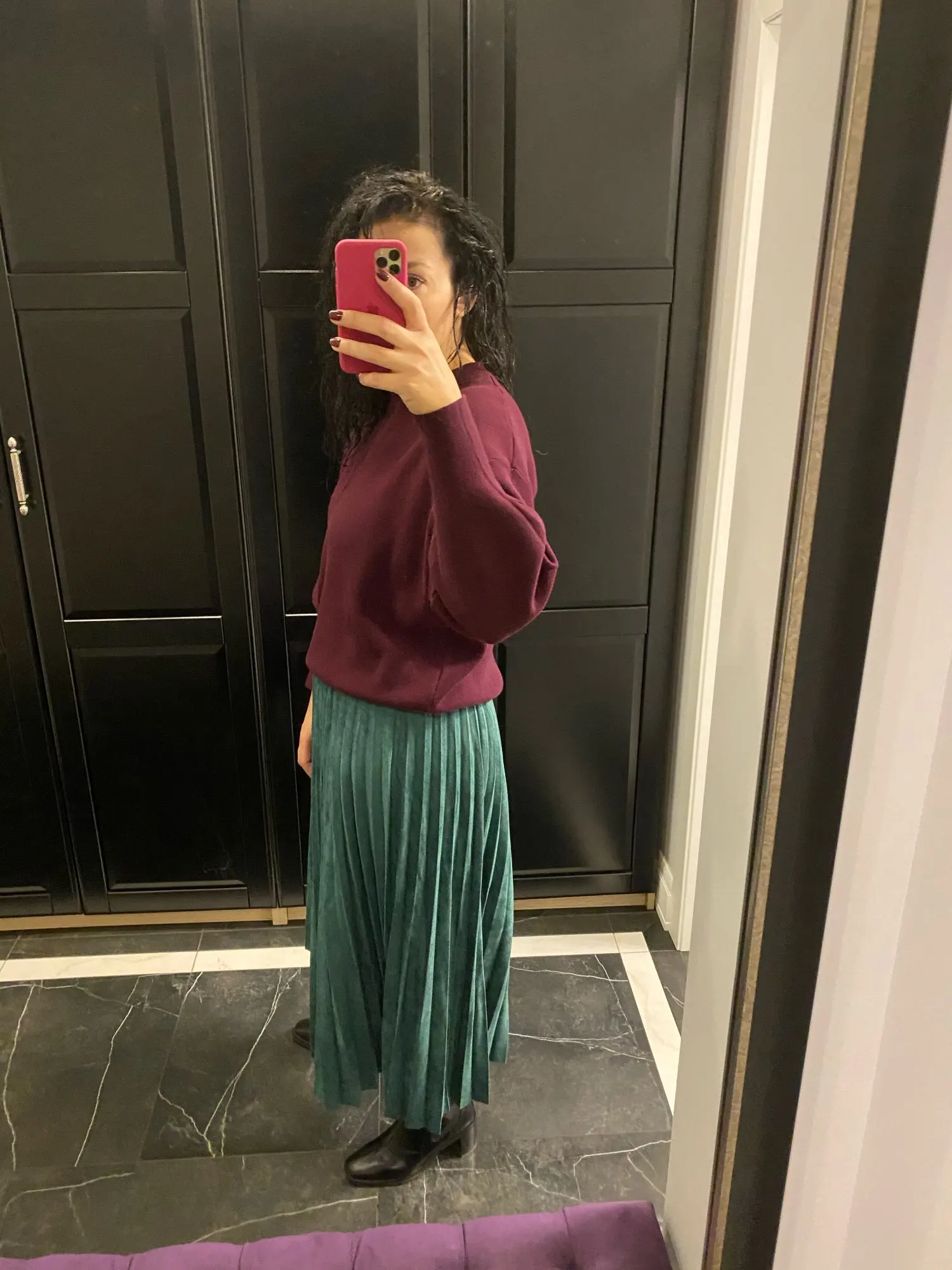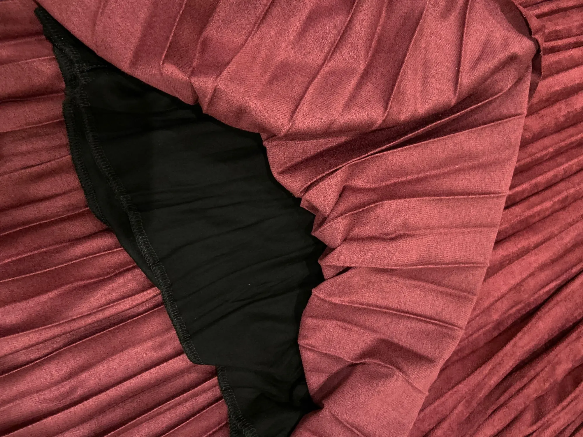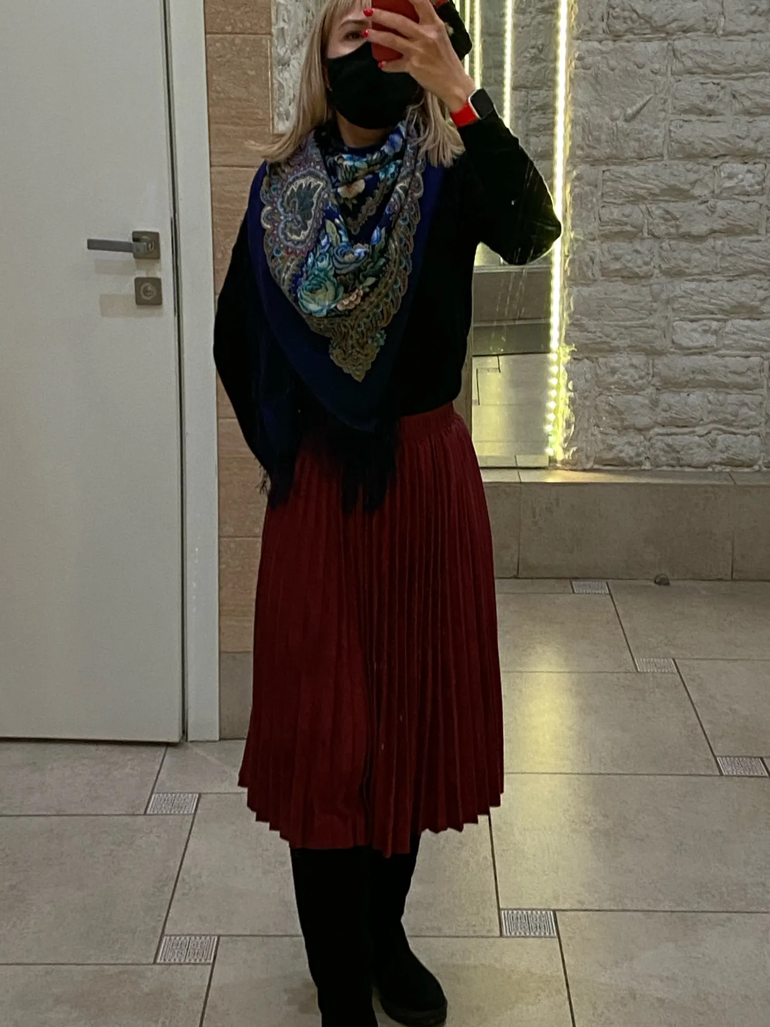 Цвет бордовый винный, красивый. Ткань плотная, как замша, есть подклад черного цвета ниже колен. Очень электризуется, прилипает всë, нужен антистатик. На талию 68 см сидит неплотнено, думаю, что подойдет на талию до 78 см точно.