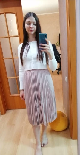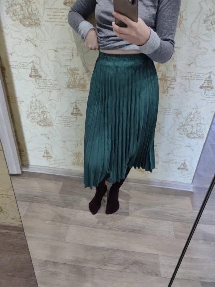 Юбка отличная! Отпарила - складки не разгладились. Ткань очень приятная. При этом есть ещё и подклад. У меня электризуется сильно. Длина в размере L до середины икры при моем росте 164 см. Обхват талии - 70, резинка ощущается