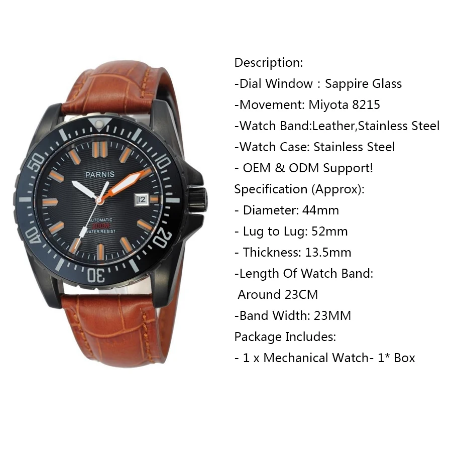 Часы наручные Parnis Мужские механические, 44 мм, 200 м, с сапфировым стеклом и футляром