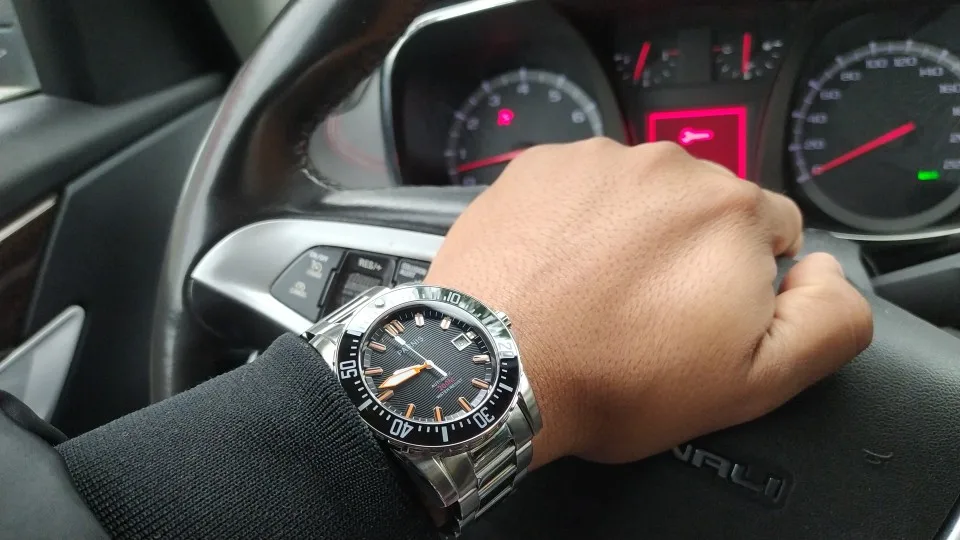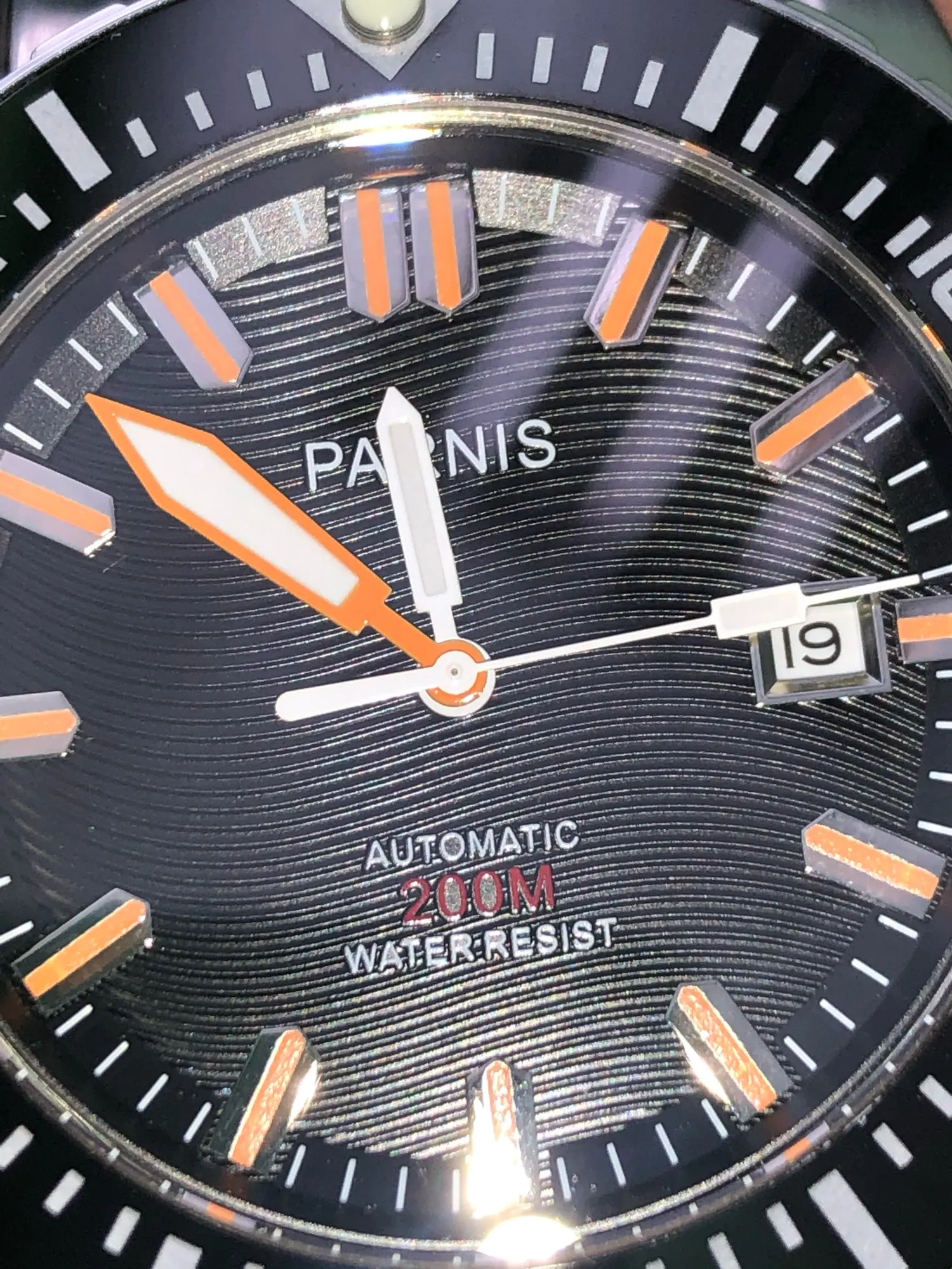 До Киева 13 дней, очень хорошо! По часам все ок. Косяков не обнаружил, все аккуратно, отделка отличная учитывая стоимость.Под стеклом чистенько,пылинок не обнаружил как и косяков. Безель на 90 кликов. Единственный минус это люм, он очень слабый, подзажали маленько а зря. Самое сильное свечение на метке безеля, стрелки так себе а метки на цифере просто печалька. Ротор атоподзавода очень шумный, прям конкретно слышно, но это специфика механизма Miyota 8215, так же как отсутствие стоп-секунды. У меня это первая miyota и наверное последняя. В целом 4+