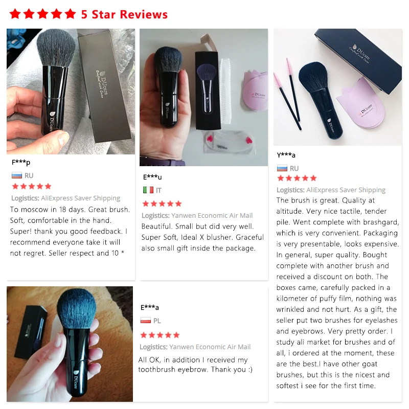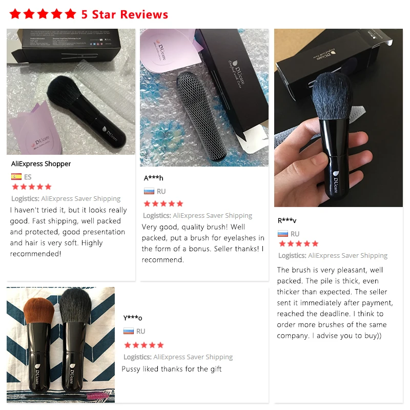 Заказ был отправлен сразу, пришел в Спб за 2 недели. Качеством самой кисти очень довольна - плотная, ровно набитая, не колется, похоже на натур. Идеальный размер, чтобы носить с собой в сумочке) Упаковка тоже отличная - сетка на ворс, фирменная коробка + внутри маленькая инструкция, как ухаживать за кистью на англ.
