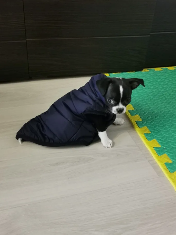 Жилет заказываем второй раз! Первый был красный размера М, заказывала на французика 4 мес как раз! Качество, цвет отличные! Первую ручную стирку выдержал. Цвет, размеры не поменялись. Сейчас собачке почти 6 месяцев, 8,8 кг, заказала XL большиват, но в зиму на толстовку будет отлично. Очень довольны!