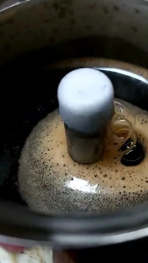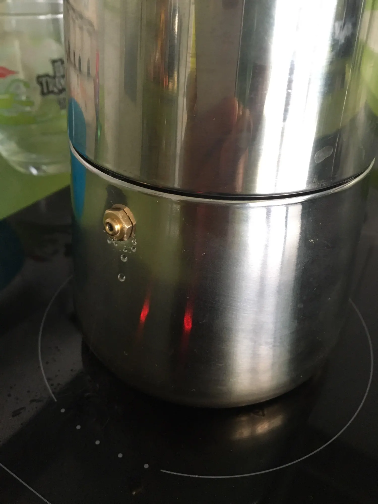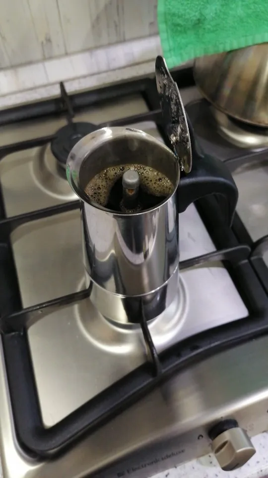 Когда он нагревается, что кофе выходит из попы кофейника поливается, и когда он остывает, он снова выглядит хорошо. Кофе очень хороший.