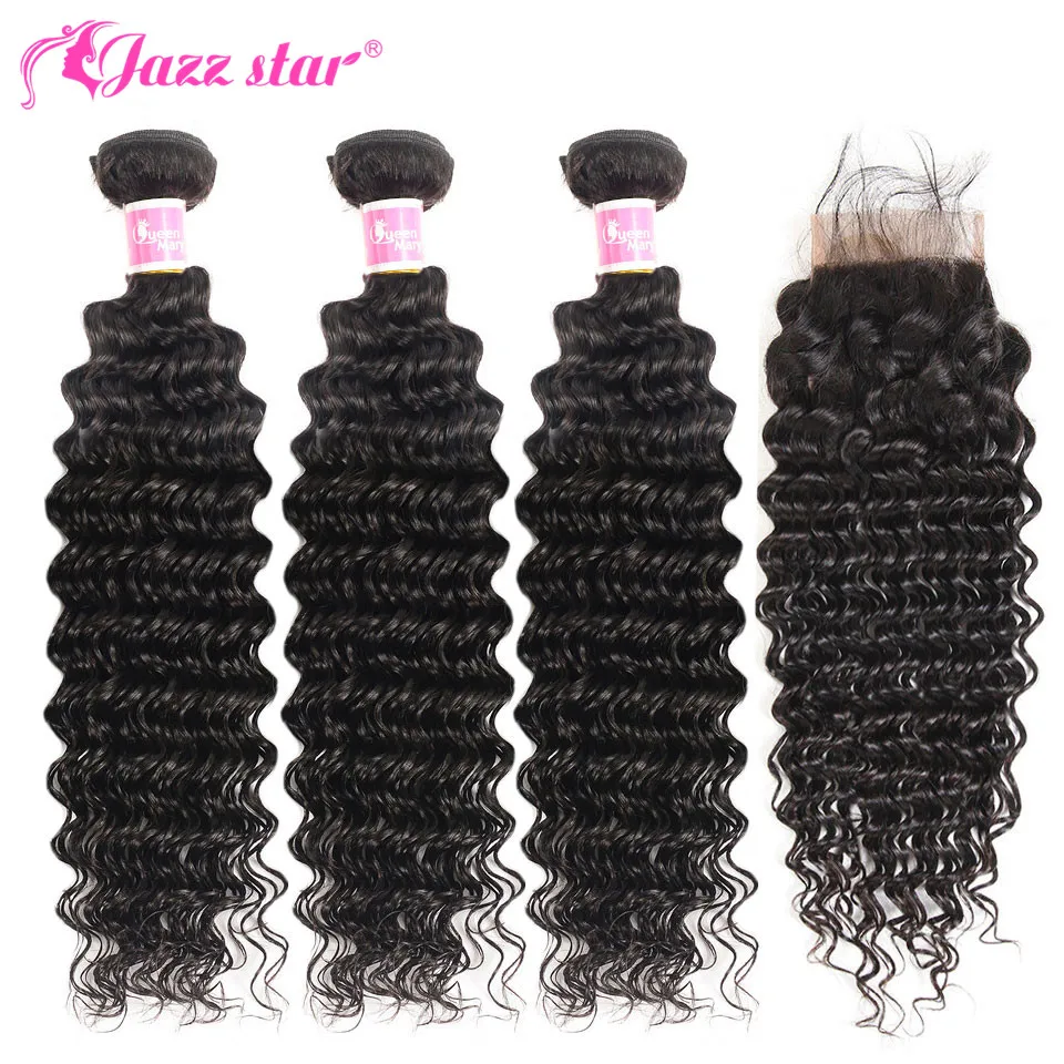 Бразильские пряди глубоких волн с застежкой, человеческие волосы без повреждений, 3 и 4 пряди с кружевной застежкой, накладные человеческие волосы Queen Mary
