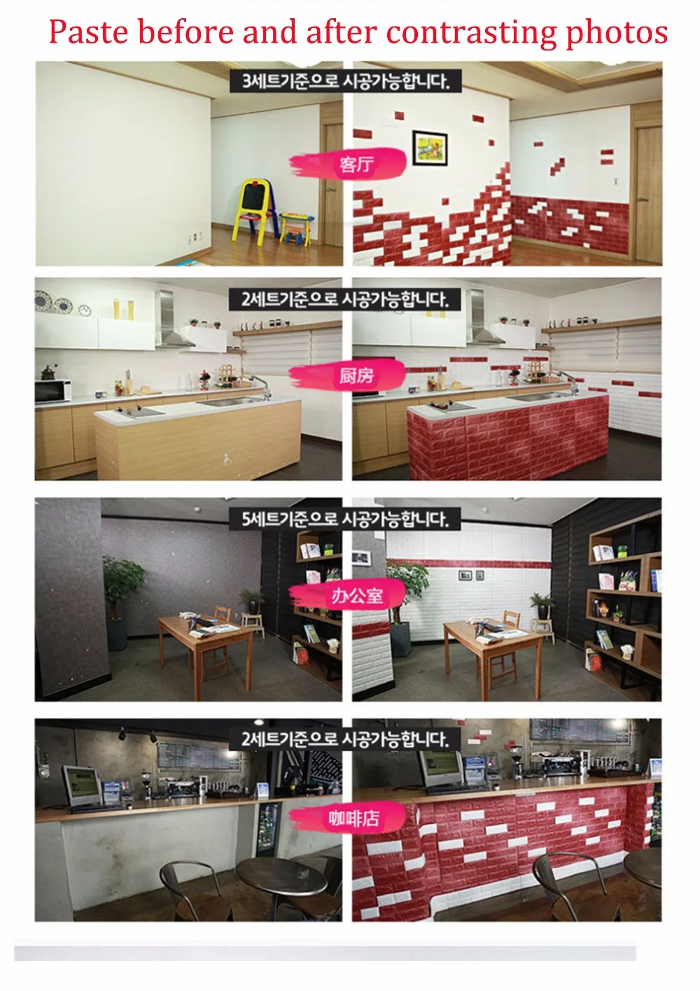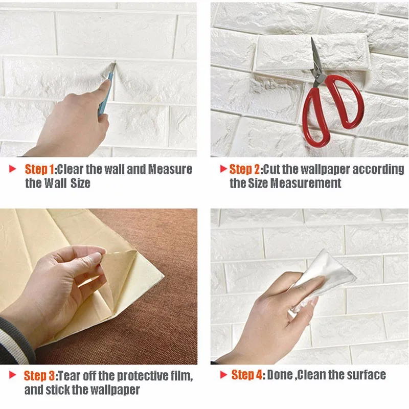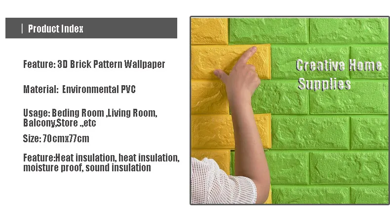 * 3D-рисунок кирпича на ощупь* Экологически чистый полиэтиленовый материал* Задняя сторона с клеем, самоклеящаяся наклейка* Водонепроницаемый, можно мыть водой* Съемные безопасные детские наклейки* Используется для гостиной/фона телевизора/спальни/детской комнаты/домашнего декора