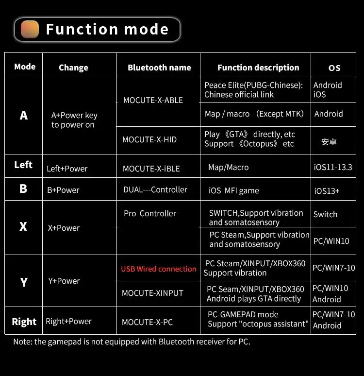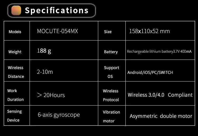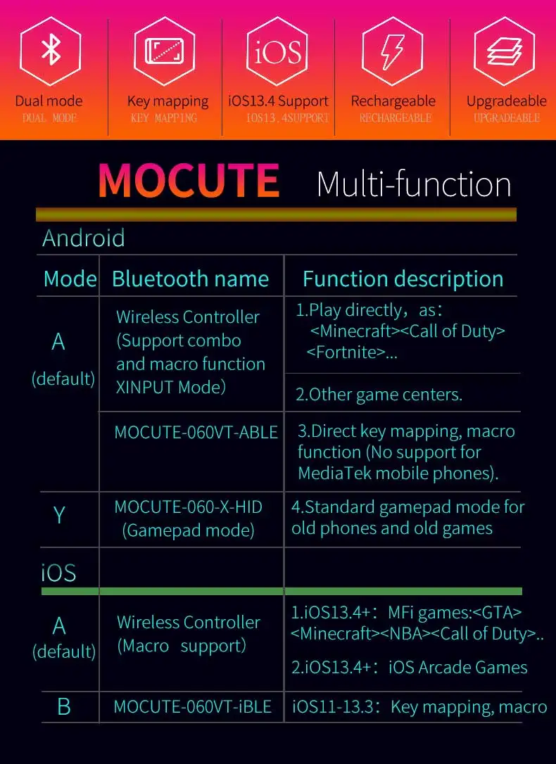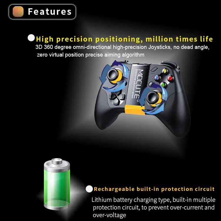 Особенности:1. Изготовлен из высококачественного материала, очень прочный.2. Эргономичный дизайн для комфортной и приятной игры.3. Поддержка Android 13,4 выше, IOS 13,4 и для Windows operate sysytem и так далее.4. Встроенный беспроводной Bluetooth 2,0-5,2, может поддерживать 2-10 метров широкий диапазон управления от операции.5. Встроенный литиевый аккумулятор, после зарядки, он может быть устойчивым в течение 40 часов, безопасным и стабильным.6. Используется для мобильный телефон, ПК и т. Д.7. Гибкость, точность, комфорт, Простота Управления, компактный и портативный.8. Поддерживает подавляющее большинство игр:Спецификация:Модель изделия: MOCUTE-060Беспроводной протокол: Двойной режим Bluetooth, совместим с 2,0-5,2Беспроводное расстояние: 2-10 метровСистема поддержки: для IOS/ANDROID/WINDOWSРазмер изделия: 226 × 90 × 46 ммПоддержка размера телефона Длина: <185 ммПерезаряжаемая батарея: 400мА литиевая батареяВремя использования: WC40/BLE160 часовЦП: ARM968E-SCoreТок Отключения: 9uA