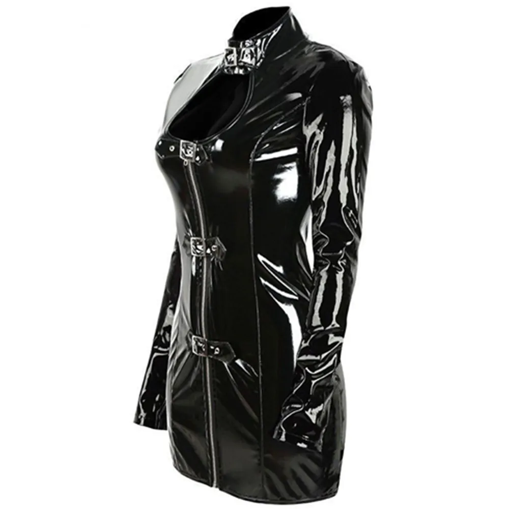 S-XXL женское платье из ПВХ с пряжкой, сексуальное черное клубное мини-платье из искусственной кожи с длинным рукавом