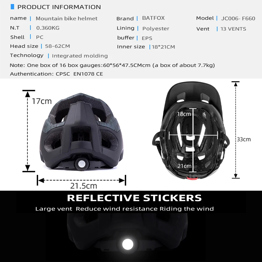 Название: шлем для верховой ездыБренд: BAT FOXМодель: F-659Размер: M/L (56-62) см регулируемыйМатериал: пенополистирол и корпус из поликарбонатаВес нетто: 362,7 гПосылка Вес: 450 гПрименение: дорога и горная езда. SkatinДисплей с несколькими угламиПосылка для ПК
