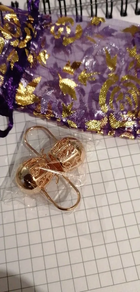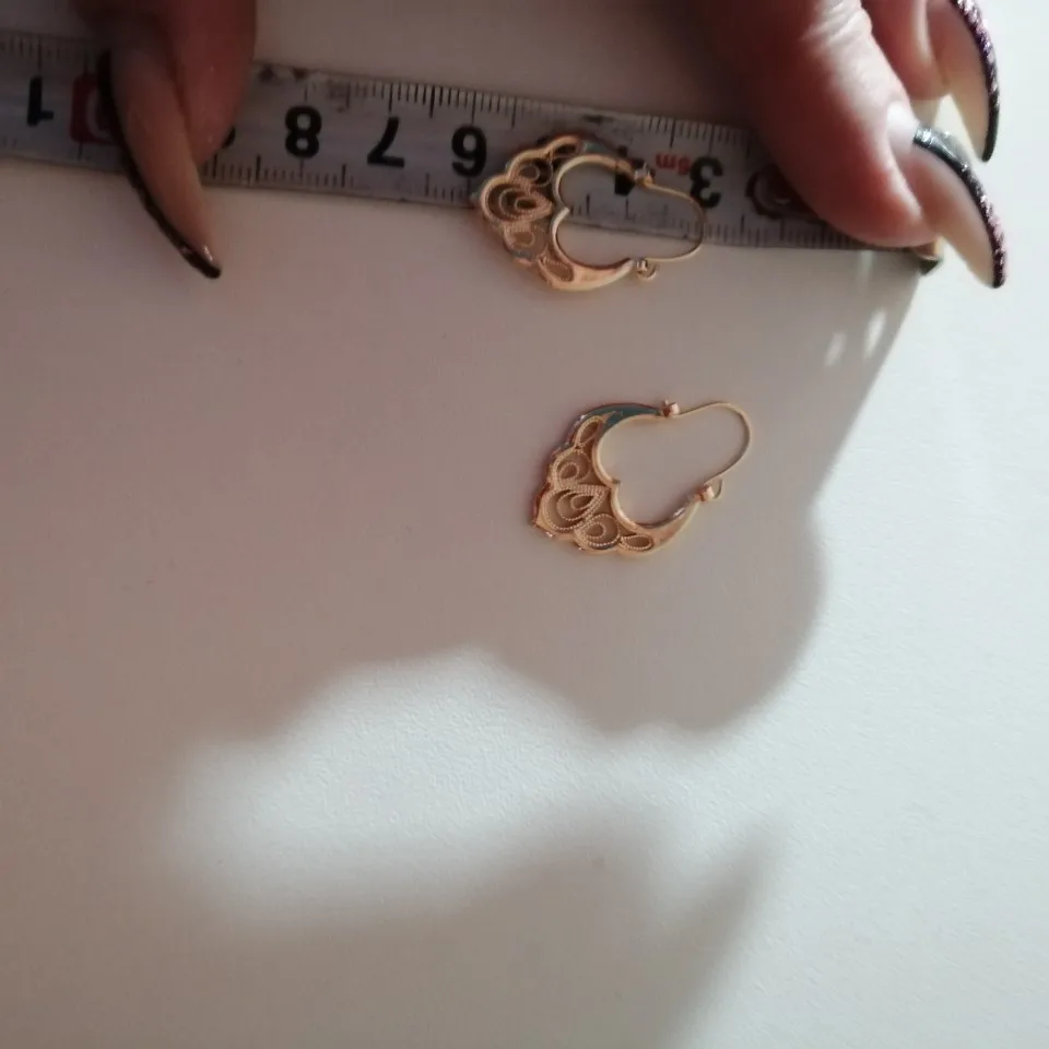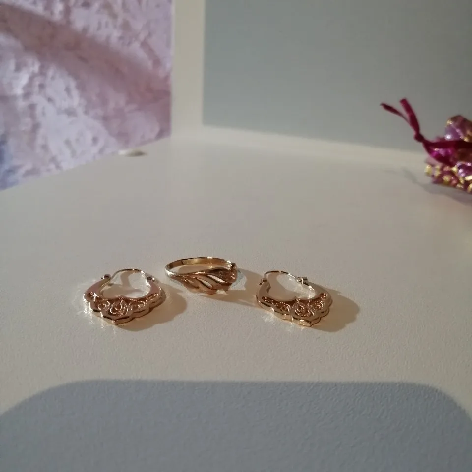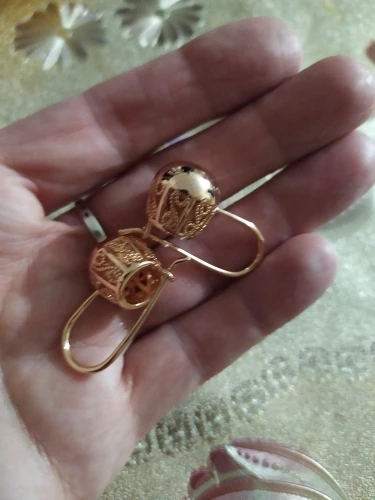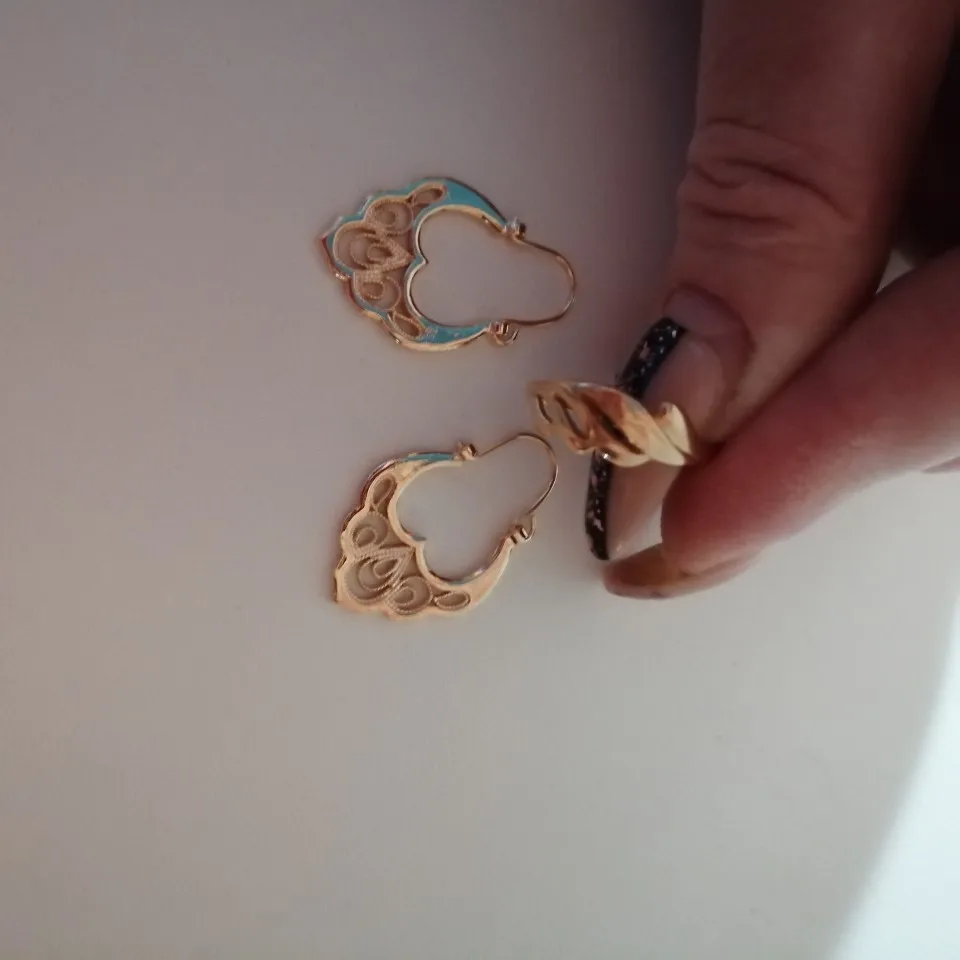 Серьги красивые, похожи на золотые, на фото вместе с золотым кольцом 585 пробы, для сравнения. Целые, не погнутые, немного надо повозиться с застёжкой, она не очень удобна или попросить кого, что бы помогли застегнуть, а так всё супер и супер быстрая доставка, до Гомеля за 16 дней