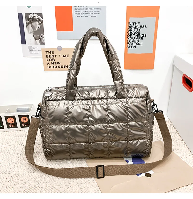 классная сумка, очень мягкая, напоминает материал, из которых шьют пуховики, и сама выглядит, как пуховик, набитый синтепоном