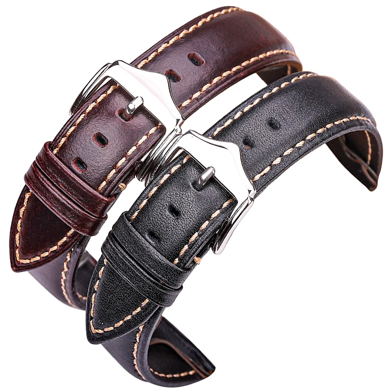 Ремешок мягкий кожаный для наручных часов, винтажный стальной браслет с серебристой пряжкой с язычком, цвет черныйтемно-коричневый, 18 19 20 21 22 24 мм