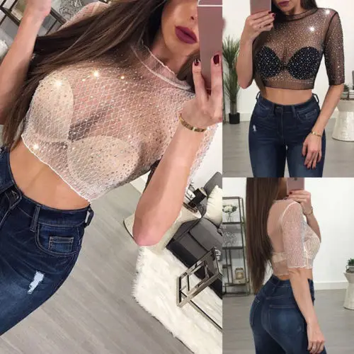 Женский укороченный топ с блестками и коротким рукавом, в сеточку