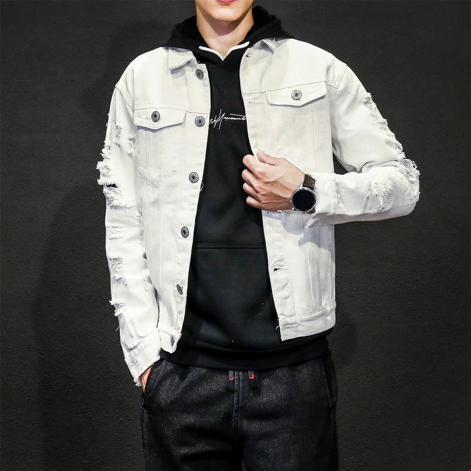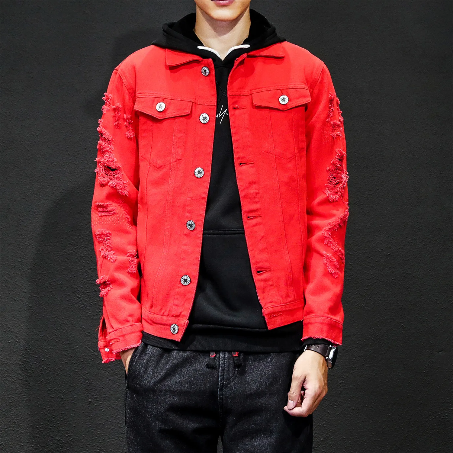 Мужская приталенная джинсовая куртка, красная, белая, черная рваная...