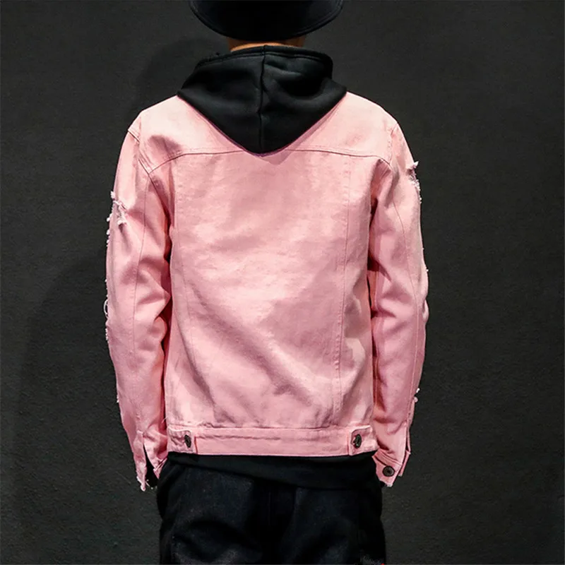 Мужская джинсовая куртка, розовая Потертая джинсовая куртка с дырка...