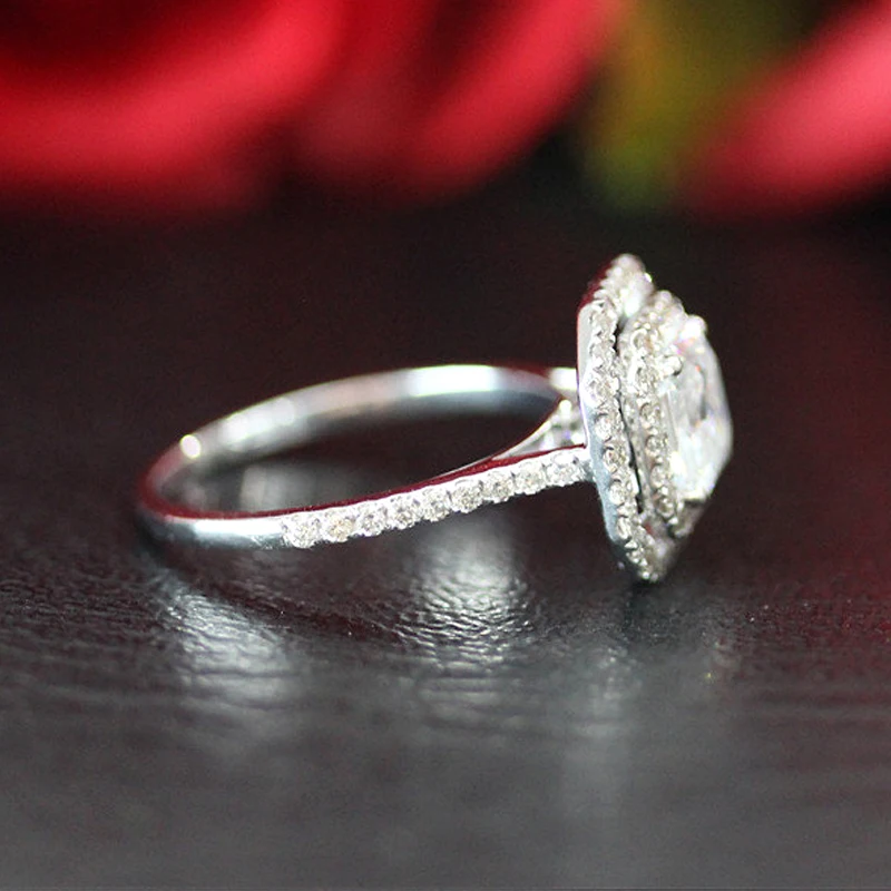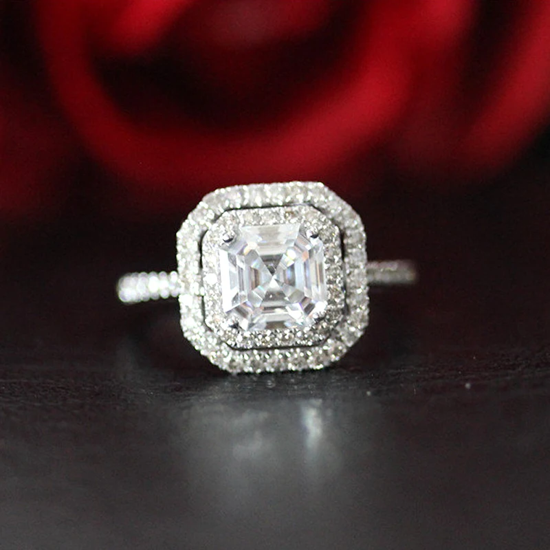 Великолепное обручальное кольцо из моиссанита размером 1.3ct 6,5 мм14K белое золото двойной Halo обручальное кольцо для женщинЦЕНТР КАМНЯ: Asscher Cut Moissanite6,5 мм, Приблизительно 1.3ctЦвет: DFЧеткость: VVS Крой: Овальный/3EXБоковой камень: Круглый моиссанитПриблизительно 0.48ctЦвет: DFЧеткость: VVS Крой: Круглый/3EX