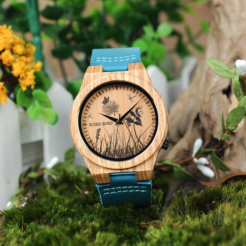Бобо птица LP20-6 пейзаж reloj mujer Часы для мужчин кварцевые часы Зебра Дерево Erkek kol saati синий кожаный ремешок часы