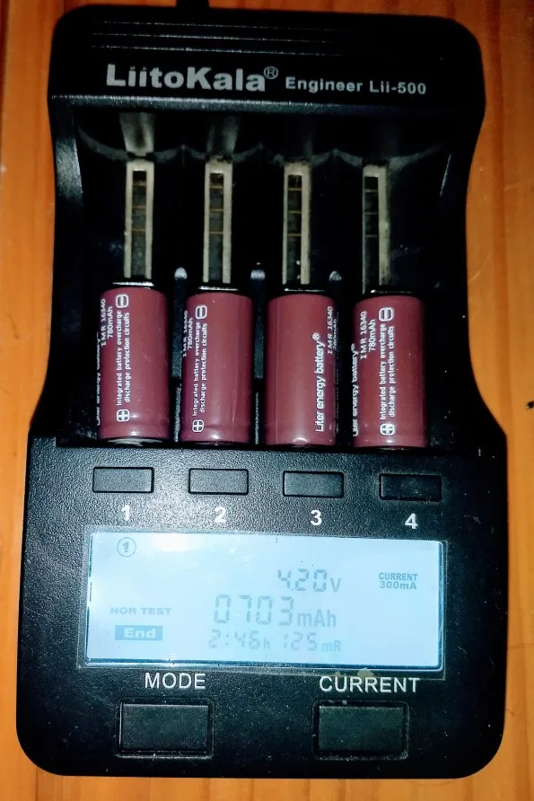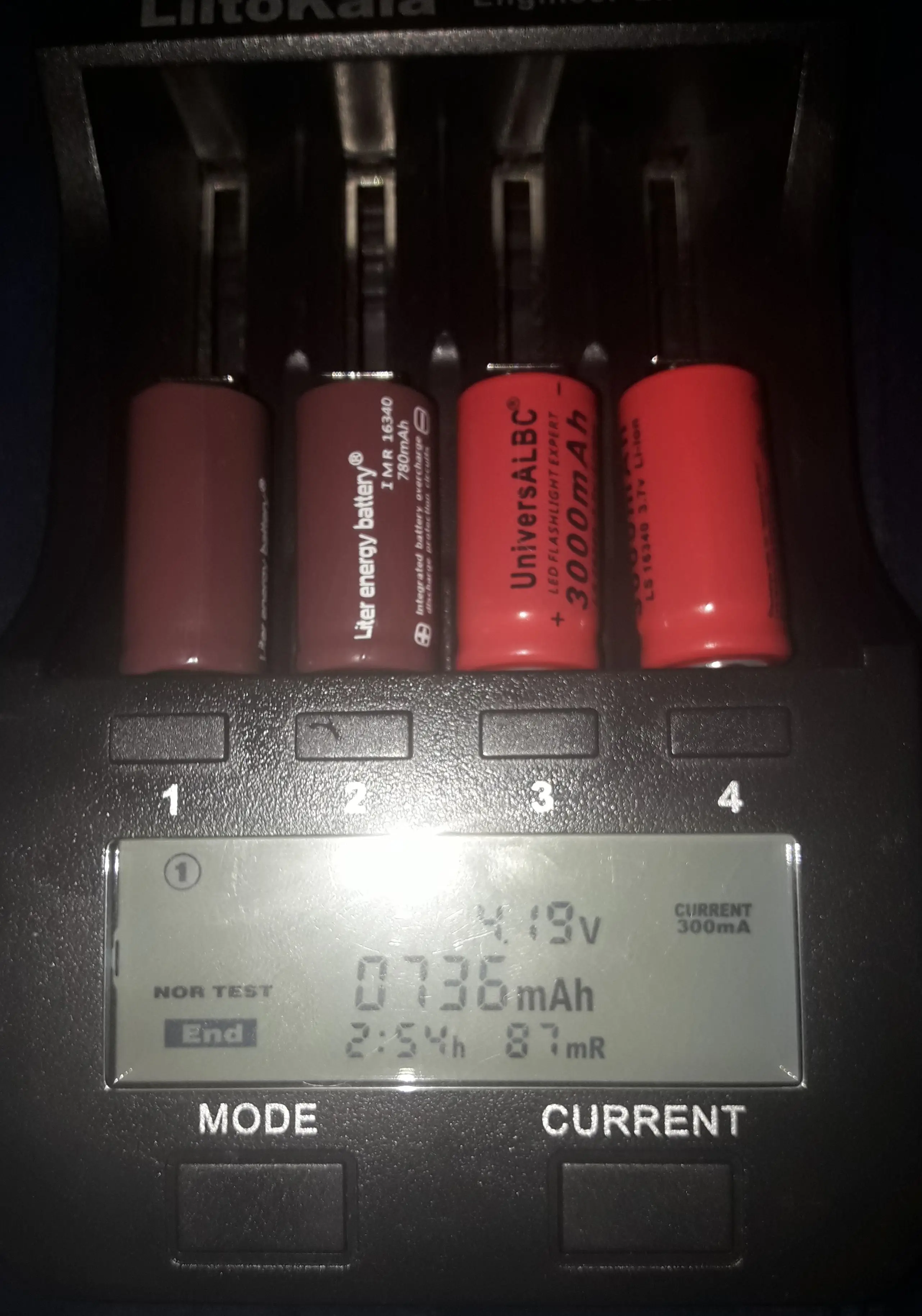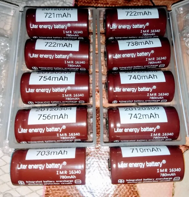 Батареи быстро прибыли в Германию, две недели и хорошо упакованы в пену. Они были полностью заряжены, что не рекомендуется. Я измерил емкость каждого из них: Заряжен до 4,2 вольт, ток разряда 0,5 A, напряжение отключения 2,7 вольт #1: 563 мАч (или 0,564 ампер часов)-1972 МВт · ч (или 1,972 Вт часов) #2: 577 мА · ч (или 0,577 ампер часов)-2030 МВт · ч (или 2,03 Вт часов) Не рекламируемая 780 мА · ч, поэтому минус 1 звезда. Я думаю, что разрядный ток на половину ампа является реалистичным из-за использования этих 16340s в небольших, но ярких фонариках. Может быть, с током разряда 200 мА они прослужат дольше.