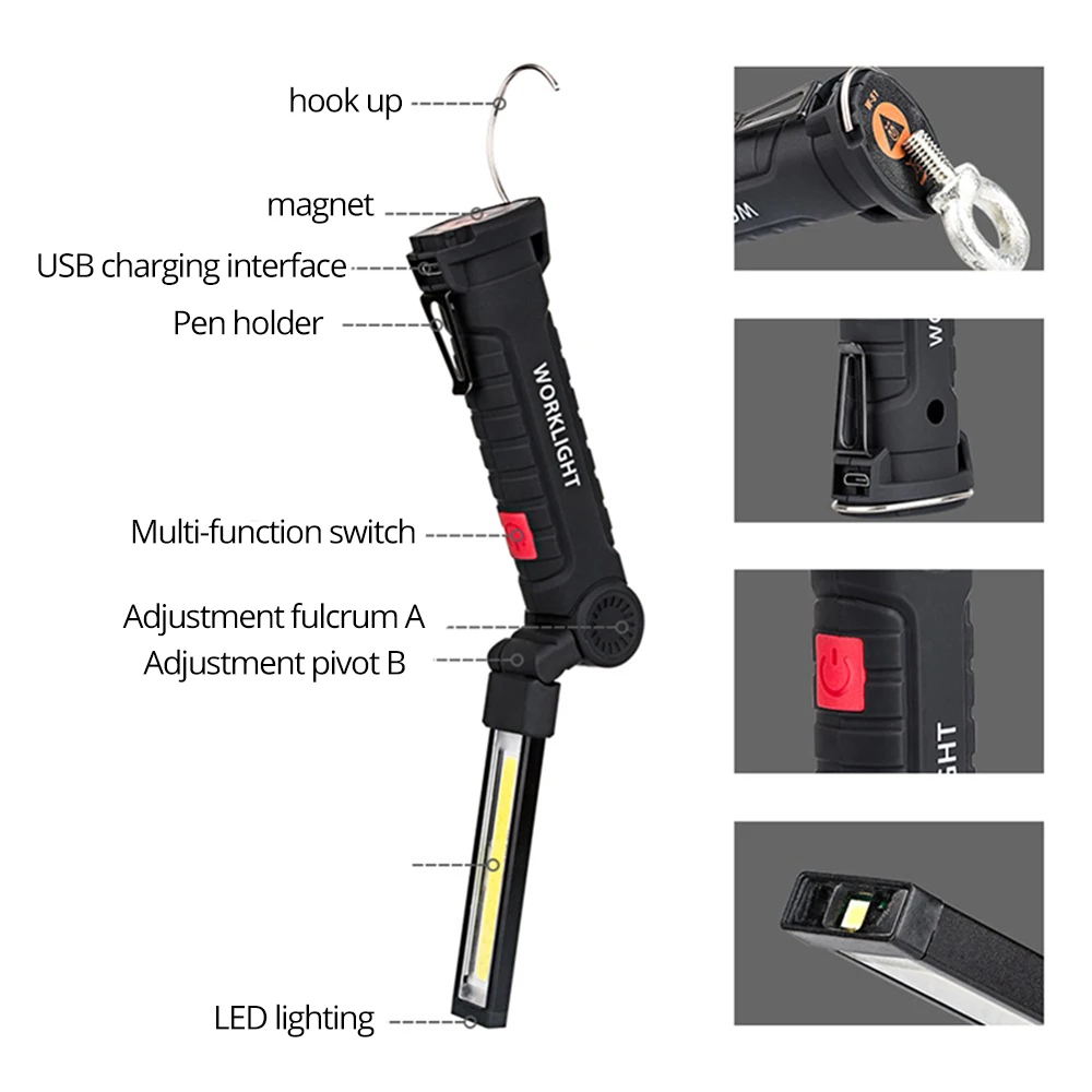 Пластиковый корпус, обернутый в слой черного углерода, приятный на ощупь, нескользящий. Поставляется с магнитом и крючком, складная конструкция, легко использовать в небольшом пространстве внутри. Светодиоды High COB, Low COB светодиодный и светодиодный светильник 3-различные светильник бы освещения для удовлетворения ваших потребностей в освещении. Светодиодные лампы экономят энергию и защищают окружающую среду, долго служат. Встроенный аккумулятор, для зарядки можно использовать USB-кабель. Примечание: маленький № Пылезащитная заглушка для USB