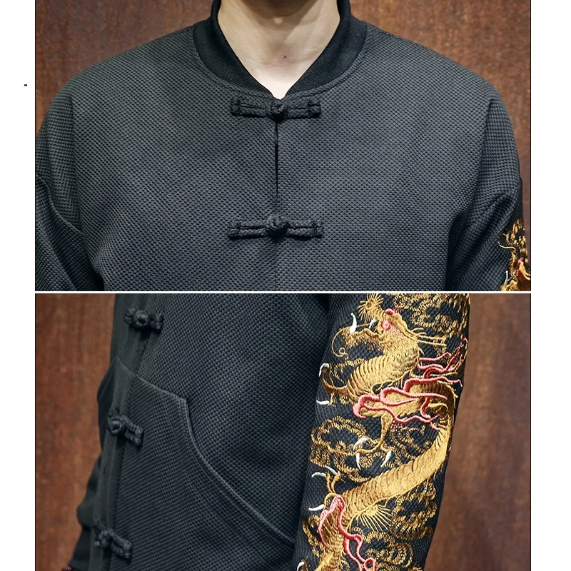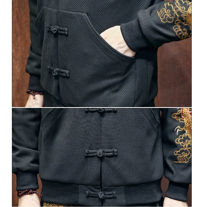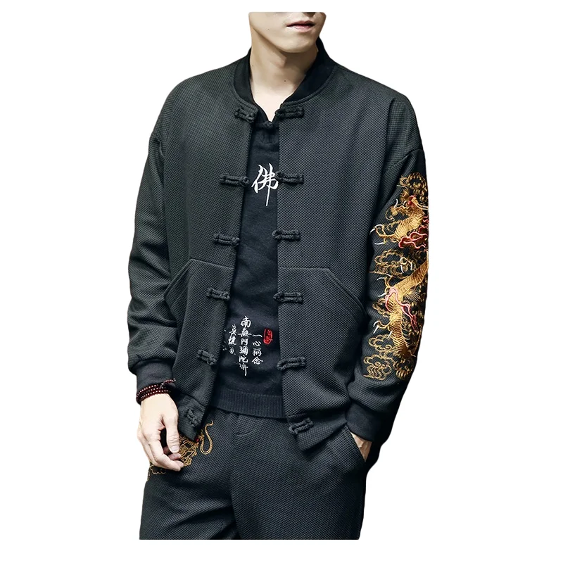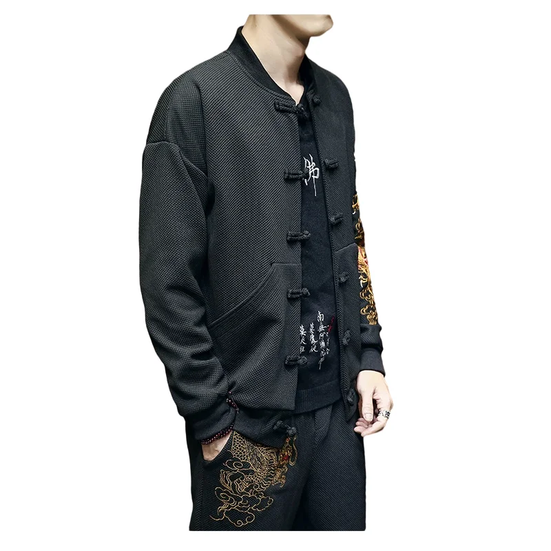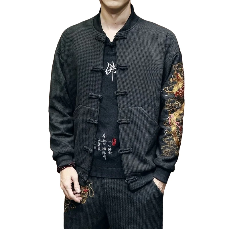 Куртка мужская с вышивкой дракона и китайским воротником, черная тр...
