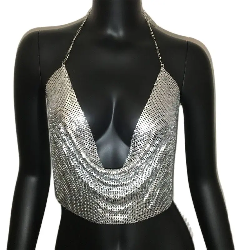 AKYZO 2022 Сексуальная Женская майка с металлическими блестками Летняя Золотая Серебряная майка с открытой спиной укороченная блестящая пляжная Клубная одежда для шоу майки