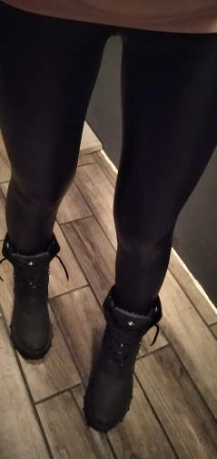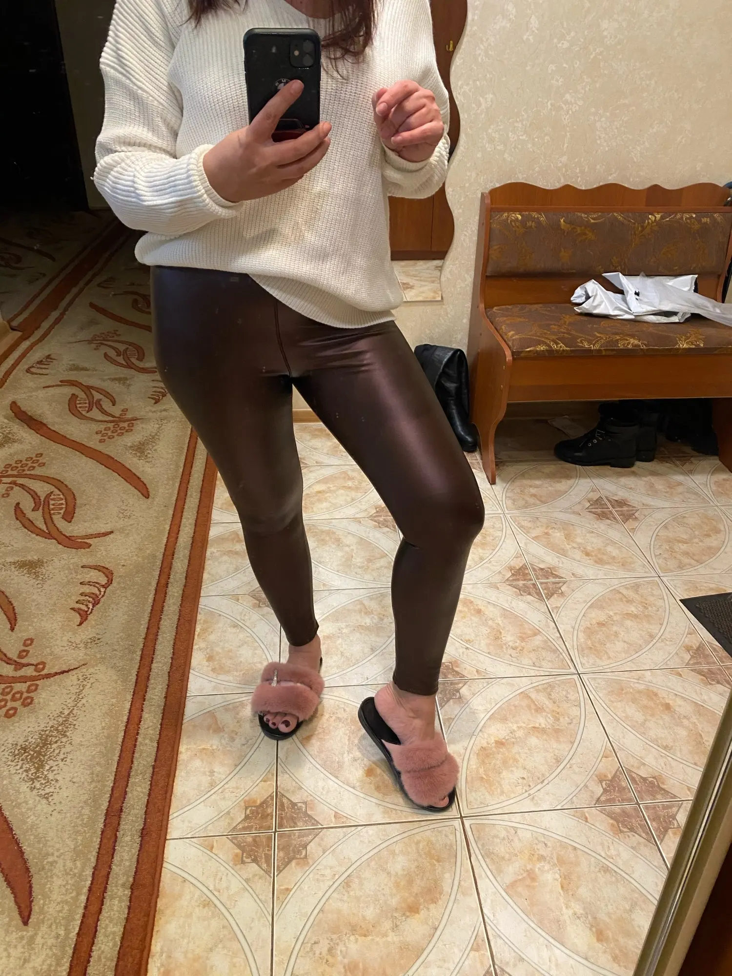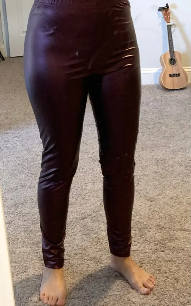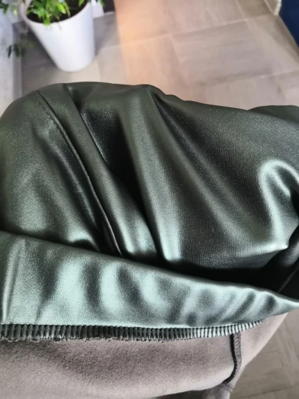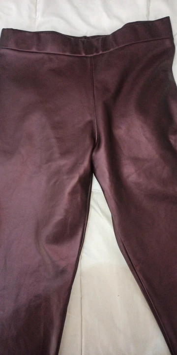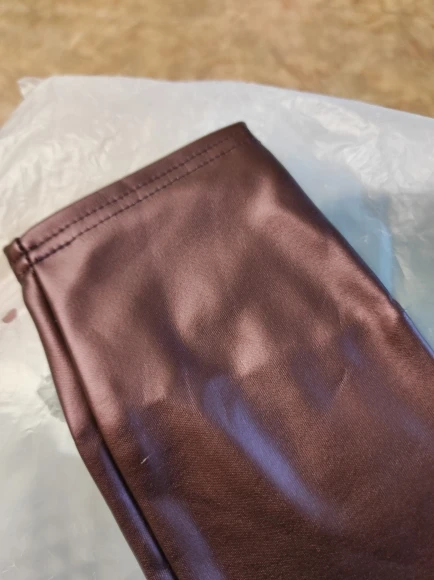 Отличные брюки. Экокожа немного имеет запах, но он быстро выветривается. На зиму даже без флиса тепло, так как ткань не пропускает воздух, очень плотная. Сидят очень хорошо. Взяла немного больше, чтобы не сильно обтягивало ногу внизу. Цвет действительно как на фото.