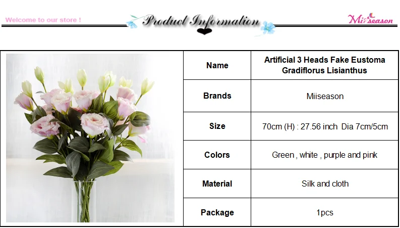 Бренд: MiiseasonИзделие: искусственные 3 головы, искусственная Эустома, лисиантусМатериал: шелк, тканьЦвета: зеленый, белый, фиолетовый и розовыйРазмер: 70 см (В): 27,56 дюйма Диаметр головки: 7 см/5 см(Пожалуйста, учитывайте небольшую погрешность в 1-2 см из-за ручного измерения и небольшой цвет для различных настроек дисплея.)Посылка: 1 шт.(Без вазы)Состояние на 100% абсолютно новыйТема: Рождественское украшение, Свадебное Украшение стен, декор вечерние в отеле, подарок своими руками или бонсай