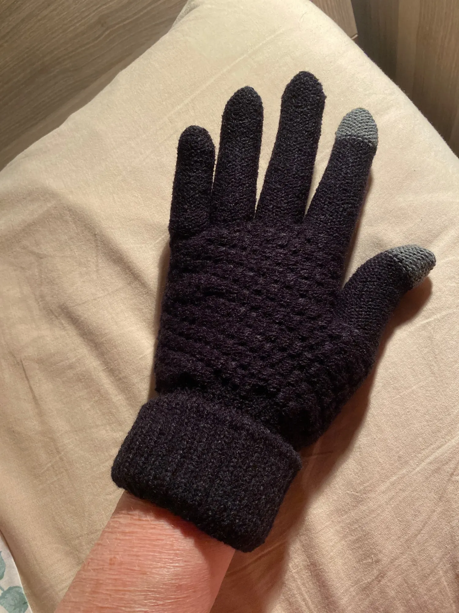 Очень тёплые,в таких в Питере зимой ходить можно:),внутри синтетика,типа флиса. Не пойму только зачем на двух пальцах серый цвет,думала ,может экран телефона будет как то реагировать на прикосновение,но нет. А так,обычные перчатки на зиму,симпатичные.