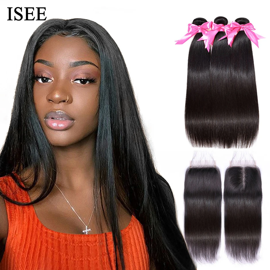 Прямые пряди волос с закрытием ISEE волосы Remy человеческие пряди волос с фронтальным бразильским плетением пряди с закрытием