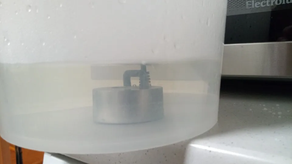 Жужжит, работает. Производительность не замерял, но на глаз литров 6-7 в сутки выплюнет. Сравнивал с бытовым увлажнителем, расход которого давно знаю. Кто не в курсе, сильно плюётся. От поверхности воды до края ёмкости 15 см крупные капли летят выше.
