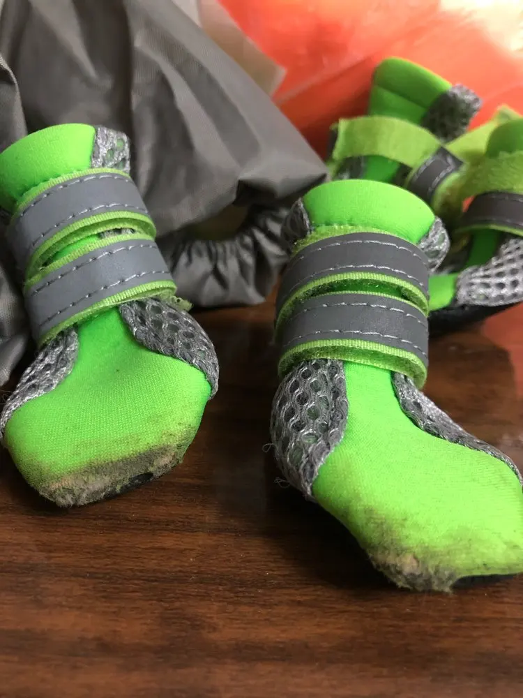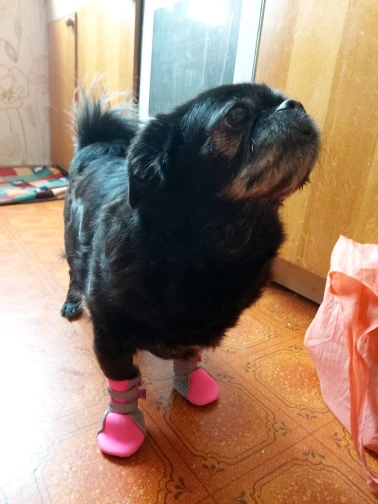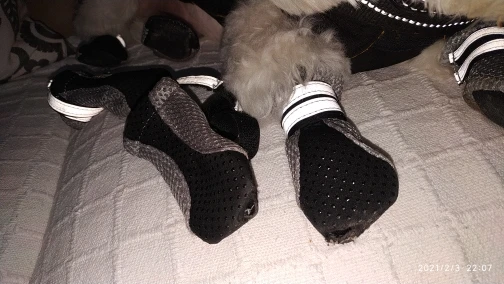 Первое впечатление: красивые. Совсем не непромокаемые, только подошва, сами из ткани. Надевать неудобно, липучка длинная за все цепляется да ещё и двойная. Йорку 2,5 кг ходить неудобно. После первой прогулки сапожки запачкались и порвались, липучка разлохматилась. Они не для прогулок.
