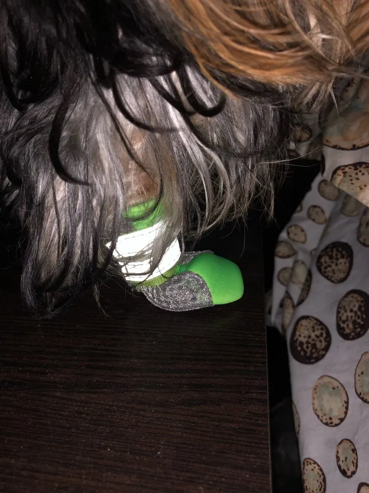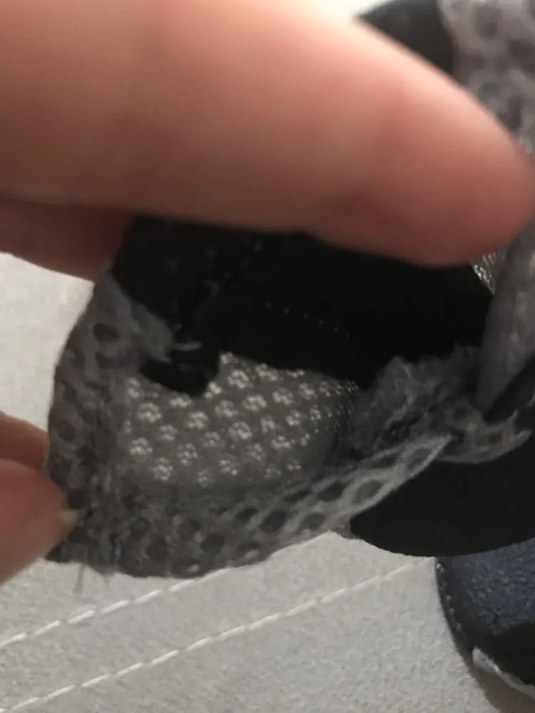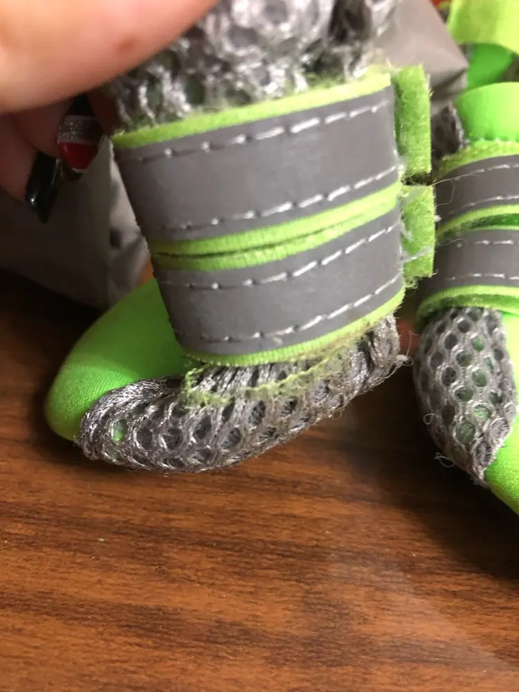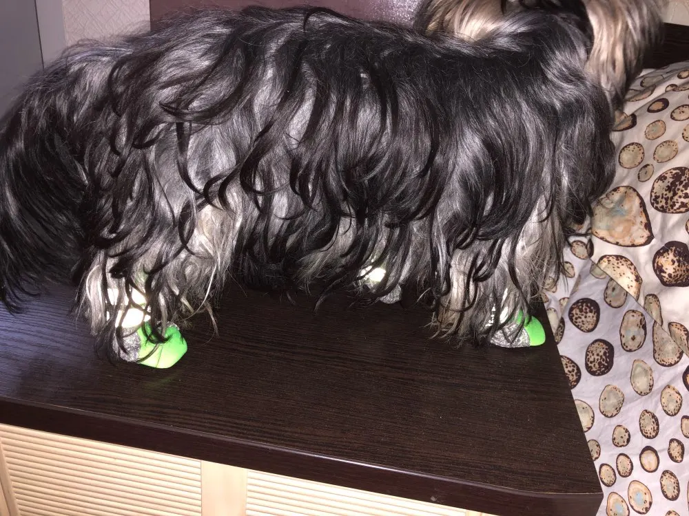 Ботинки сшиты аккуратно, ткань, типа плащевки с сеточкой. Очень длинные липучки, на тоненькие ножки йорка приходится обкручивать несколько раз, в принципе их можно укоротить, обрезать, весной подумаем.
