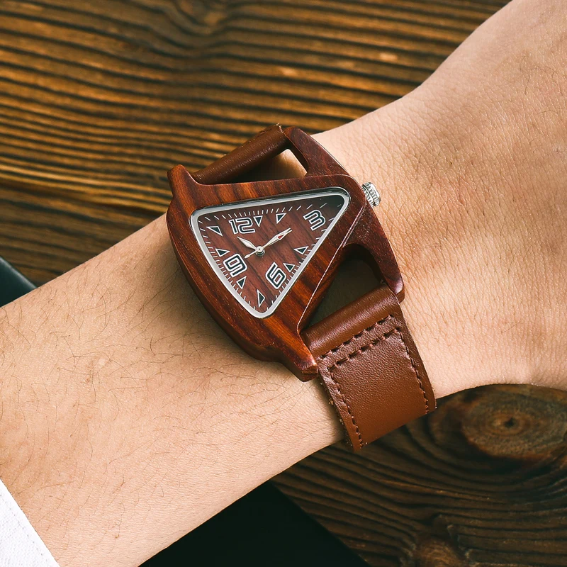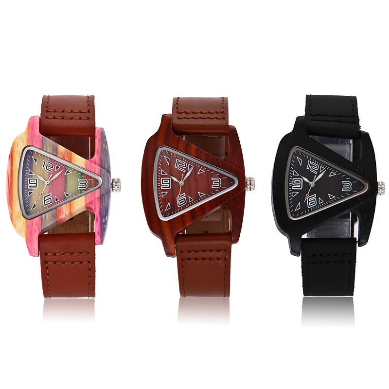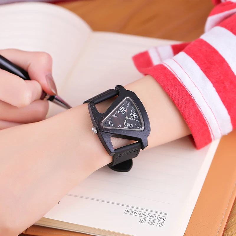 Часы женские кварцевые с деревянным ремешком, креативные треугольные наручные, с кожаным ремешком, чёрные