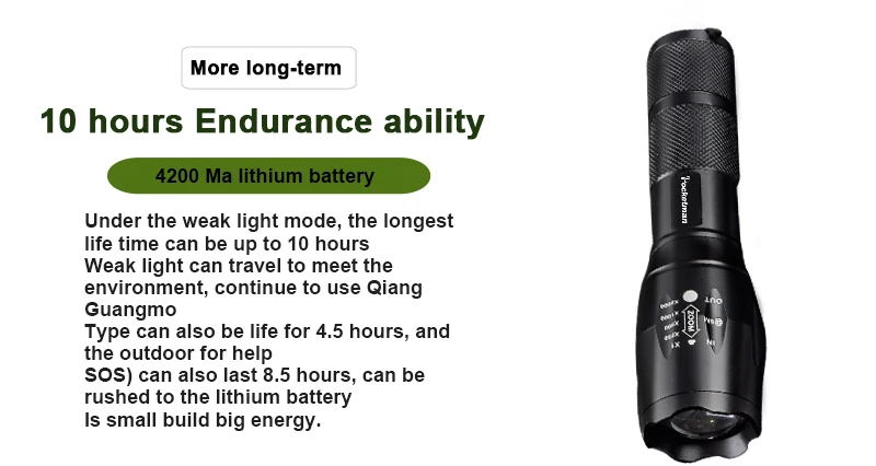 Особенности:1. Корпус этого фонарика изготовлен из высококачественного алюминиевого сплава, и он имеет очень прочную конструкцию2. Внутренняя проводка применяет высокоэффективный усилитель цепи, и может использовать батареи в большой степени3. Отличный водонепроницаемый, подходит для наружной среды, неблагоприятных погодных условий, за исключением дайвинга4. Функция фокусировки, позволяющая фокусировать луч.