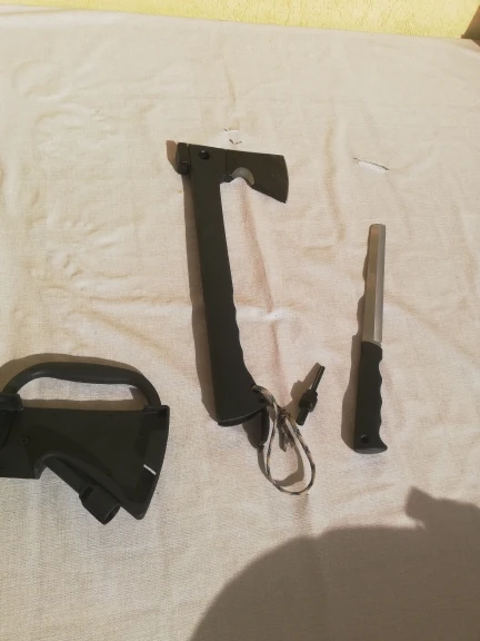 по прибытию отвалился фиксатор чехла. а так все норм. по ручка полностью полая. кажется хрупкой время покажет. топор и нож в нем острые это + .в руке лежит хорошо!