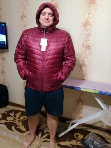 До Украины дошла посылка за месяц. На рост 172 брали на 46-48 наш - китайский. Red + XL. На худого по ощущению, можно было и меньше. В принципе смотрится не плохо. Но это не пуховик, хотя пух там таки есть, а скорее ветровка на пухе. Пух слегка появляется на одежде, но не критично. Рекомендую.