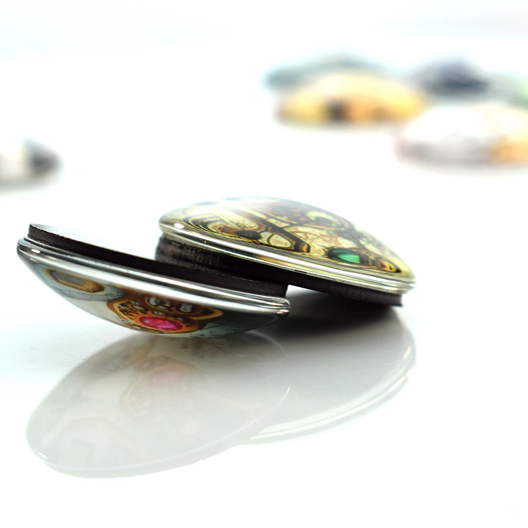 Диаметр 30 мм: мини и мило, легко носить с собой.Переднее стекло: яркое и красивое. Уникальное украшение.Задняя Магнитная сторона: легко снимается, никаких следов. Простой в использовании, может использоваться Магнитная доступная плоскость.